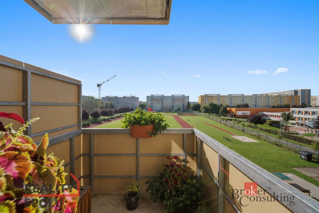 Součástí bytu je balkon s příjemným výhledem na sportoviště a garážové stání, které je již zahrnuto v ceně nájmu. Interiér je částečně vybaven nábytkem, takže je připraven k okamžitému nastěhování.