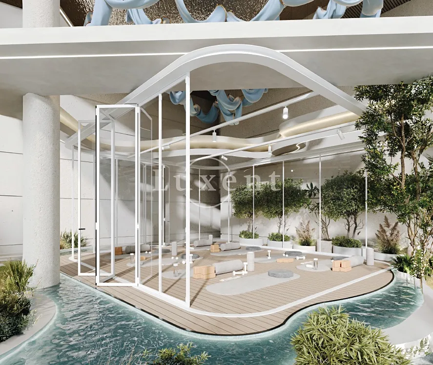 Budova disponuje úchvatnými zahradními prostory pro relaxaci a trávení volného času. Inovativní závěsný bazén se skleněnou základnou nabízí jedinečný a dechberoucí vodní zážitek. Kromě toho mají vybrané apartmány soukromé bazény.