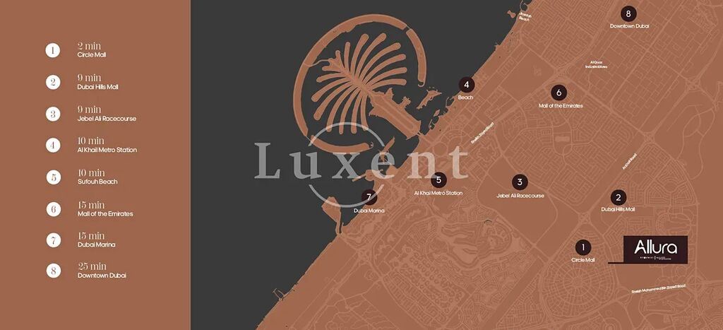Rezidence se nachází v srdci oblíbené rezidenční komunity Jumeirah Village Circle (JVC). Najdete zde vše, co potřebujete pro moderní městský život. V blízkosti projektu se nachází mnoho klíčových bodů Dubaje. Komplex je vzdálen pouhé 2 minuty jízdy od nákupního centra Circle Mall, 9 minut od prestižního Dubai Hills Mall a 10 minut od stanice metra Al Khail. Do známého Mall of the Emirates se dostanete za pouhých 15 minut, stejně tak jako do luxusní čtvrti Dubai Marina. Do centra Dubaje cesta trvá 25 minut.