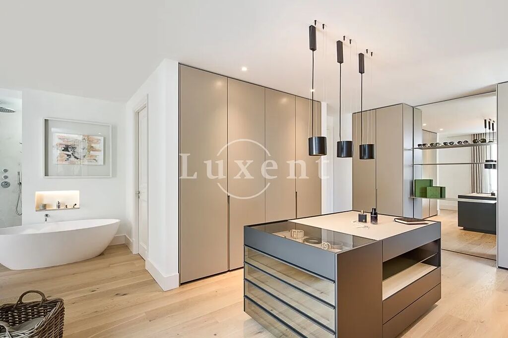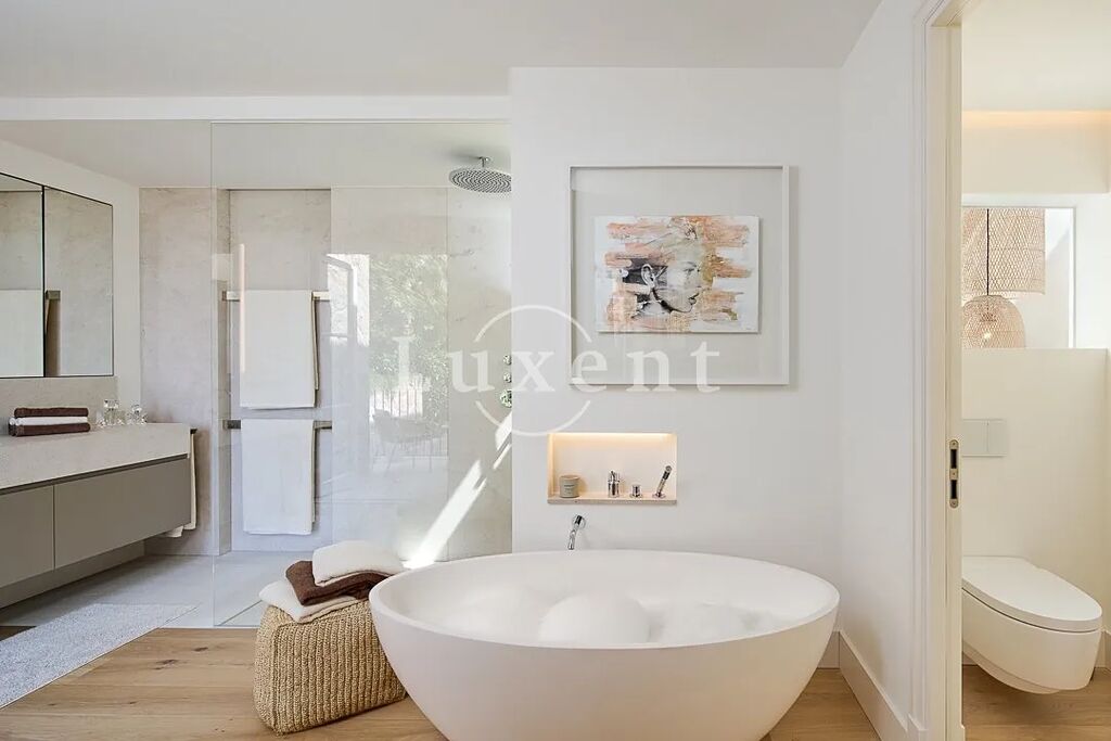 V horním patře vás čeká hlavní ložnice o velikosti 60 m2, s prostornou šatnou a luxusní koupelnou s volně stojící vanou, dešťovou sprchou a soukromou terasou. Celý dům je vybaven vysoce kvalitními materiály, včetně dubových parket v ložnicích, podlahového vytápění ve všech obytných místnostech a značkových spotřebičů.