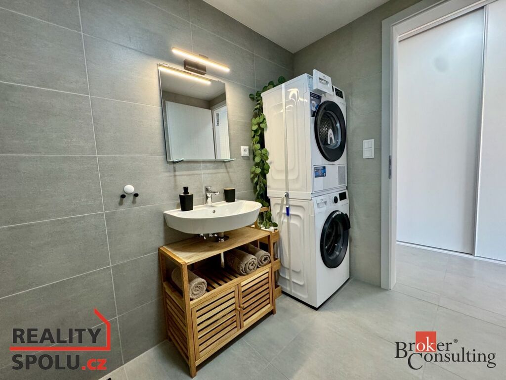 Byt je plně vybavený nábytkem, včetně velké postele, sedačky, stolkem pod TV a jídelním pultem se židlemi. Moderní kuchyňská linka je kompletně vybavena elektrickými spotřebiči, lednice, mrazák, indukční deska, myčka a mikrovlnná trouba.
