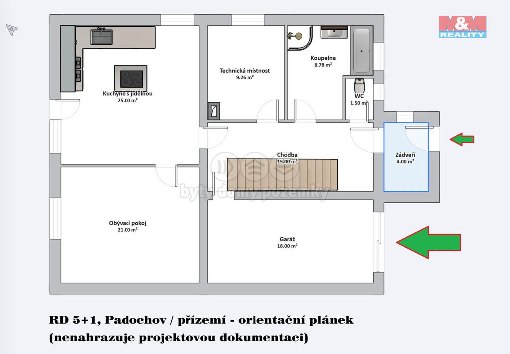 V přízemí se nachází obývací pokoj s kuchyní, koupelna, WC, technická místnost a garáž. Z jídelny je přímý vstup na zastřešenou terasu a navazující zahrádku.