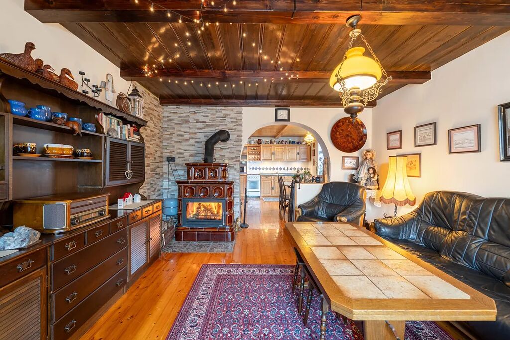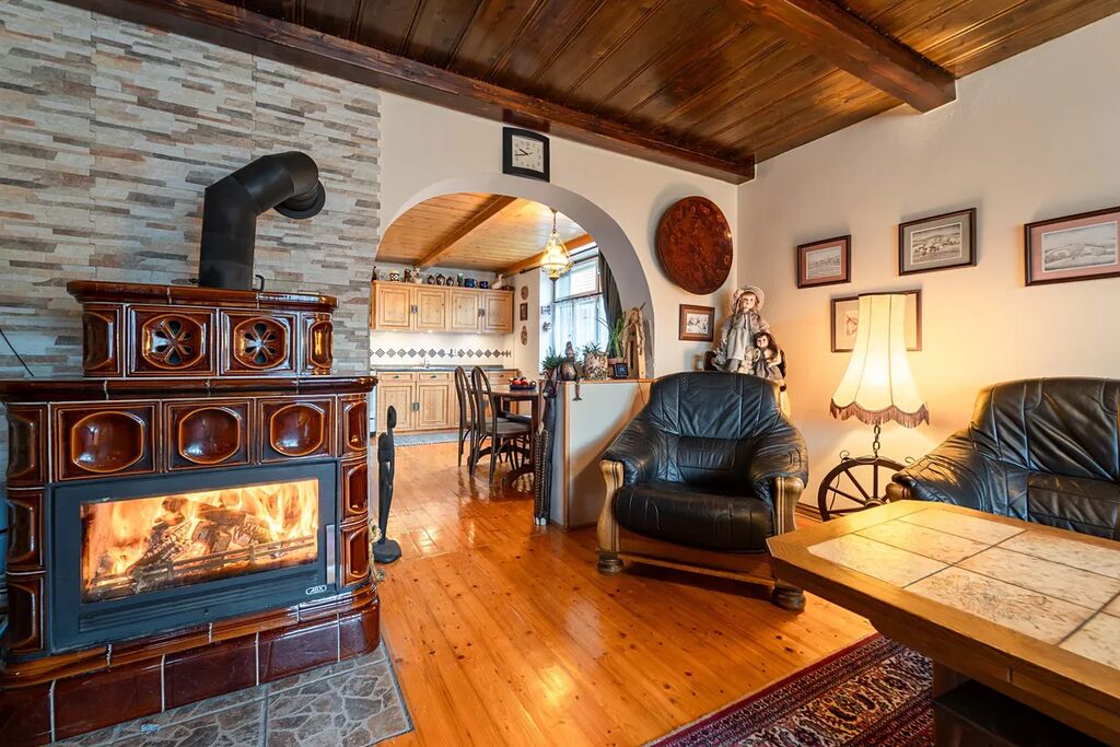 * Kuchyně s kachlovými kamny/pecí: Prostorná kuchyně, která láká k vaření, je vybavena kachlovými kamny/pecí, která nejen efektivně vytápí, ale i dodávají prostoru rustikální šarm.