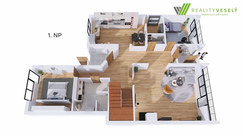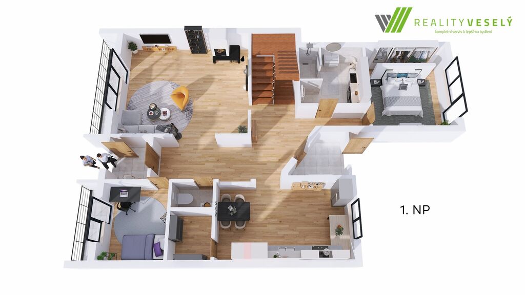 Přízemí (1. NP) tvoří společenskou a klidovou zónu: Z prostorné haly se schodištěm se dostanete do velkorysého obývacího pokoje s vlastním balkonem, kde teplo zajišťují krbová kamna s teplovodním výměníkem. Obývací pokoj je skrz halu elegantně propojen s kuchyní, která je doplněna praktickou komorou (spíží). Velkou výhodou je ložnice s vlastní šatnou a výhledem do zahrady, dále hostinský pokoj s balkonem, moderní koupelna se sprchovým koutem a samostatná toaleta. Z haly vedou schody jak do patra, tak také do suterénu domu s garáží a technickým zázemím.