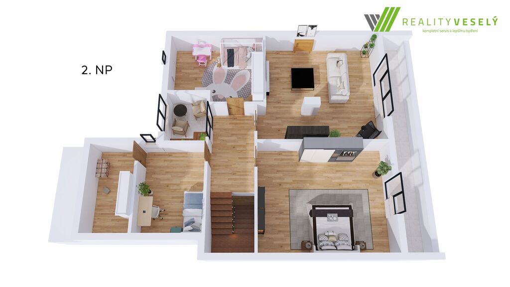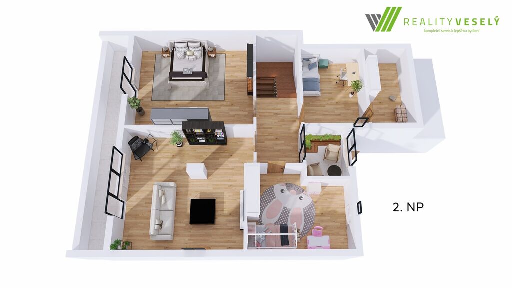 Obytné podkroví je zasvěceno odpočinku a práci: Zde naleznete dva prostorné dětské pokoje s výstupem na uzavřený balkon (lodžii), samostatnou pracovnu a další pokoj se saunou, která Vám zajistí odpočinek po náročném dni v práci. Odpočinek podtrhne i relaxační koutek s posezením a výhledem do zahrady.