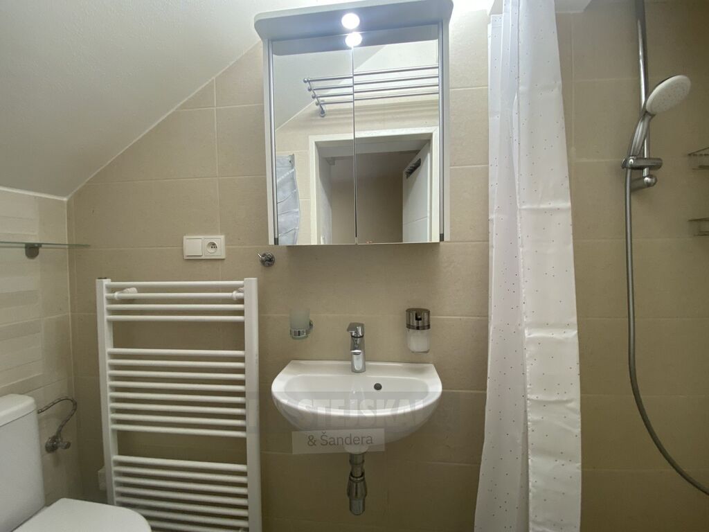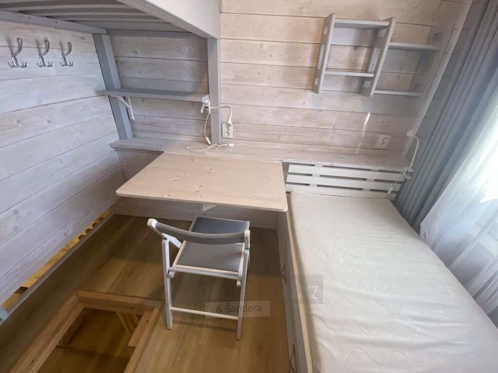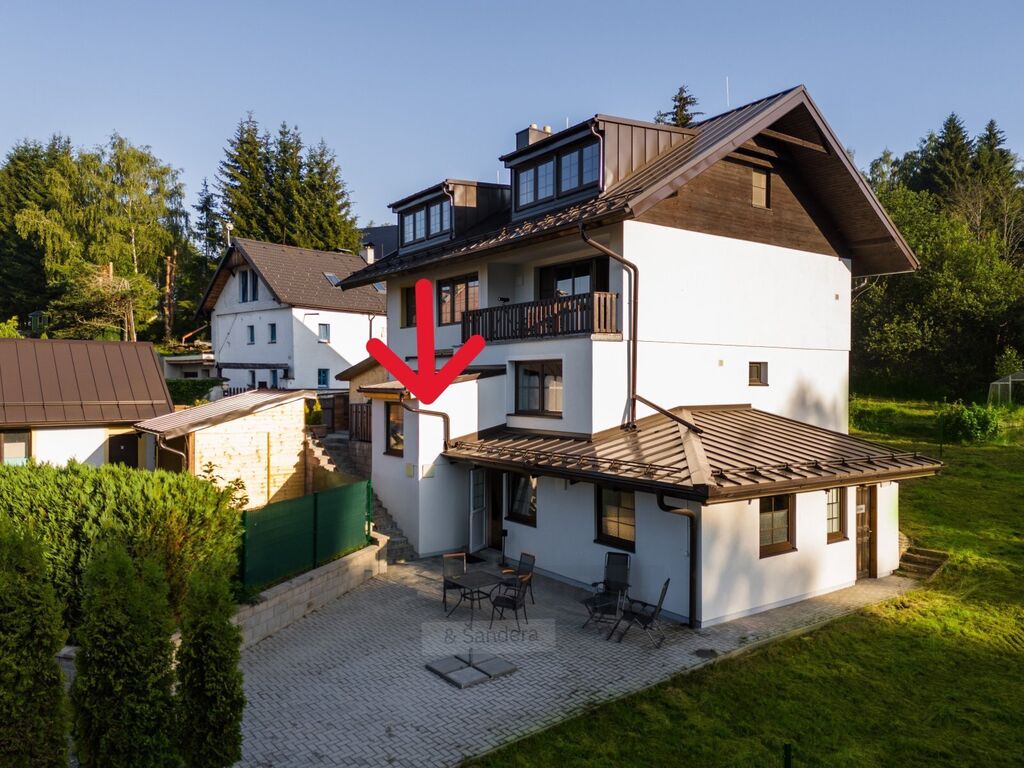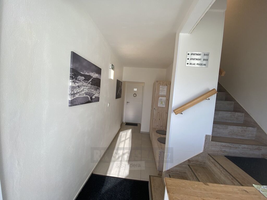 K prodeji mezonetový apartmán - nebytový prostor, umístěný v přízemí domu. Tato jednotka je o velikosti 32,2 m2. Skládá se z větší místnosti s kuchyňskou linkou, jídelním koutem, sedačkou, krbovými kamny, policovým systémem na TV, malým stolkem a velkou manželskou postelí. V mezonetu jsou dvě postele a stolek. Movité věci jsou v ceně prodeje. V koupelně se nachází sprchový kout, umyvadlo, zrcadlová skříňka nad umyvadlem a WC. V malé předsíni je umístěn botník s věšákem. Kuchyňská linka - lednice s mrazničkou, sporák, mikrovlnná trouba, dřez, vše včetně vybavení. Další uzamykatelné úložné prostory pro tuto jednotku se nacházejí ve společné chodbě domu.