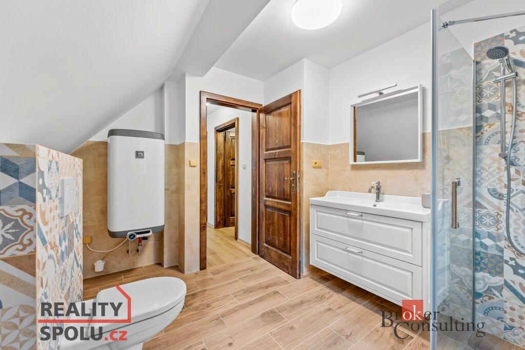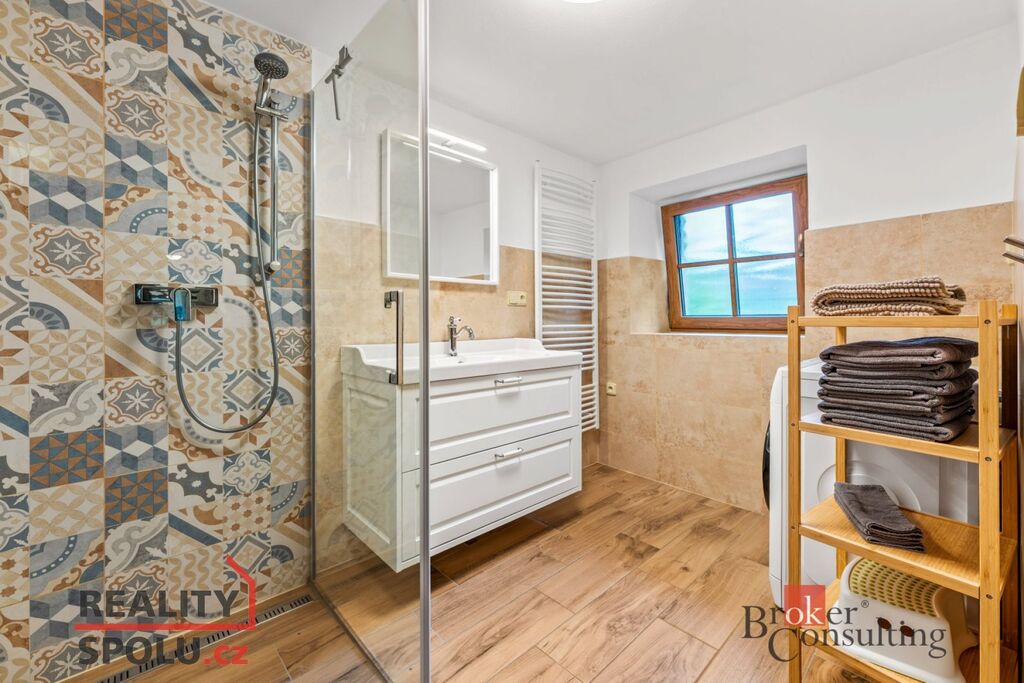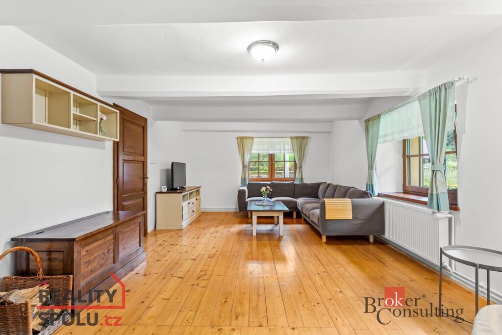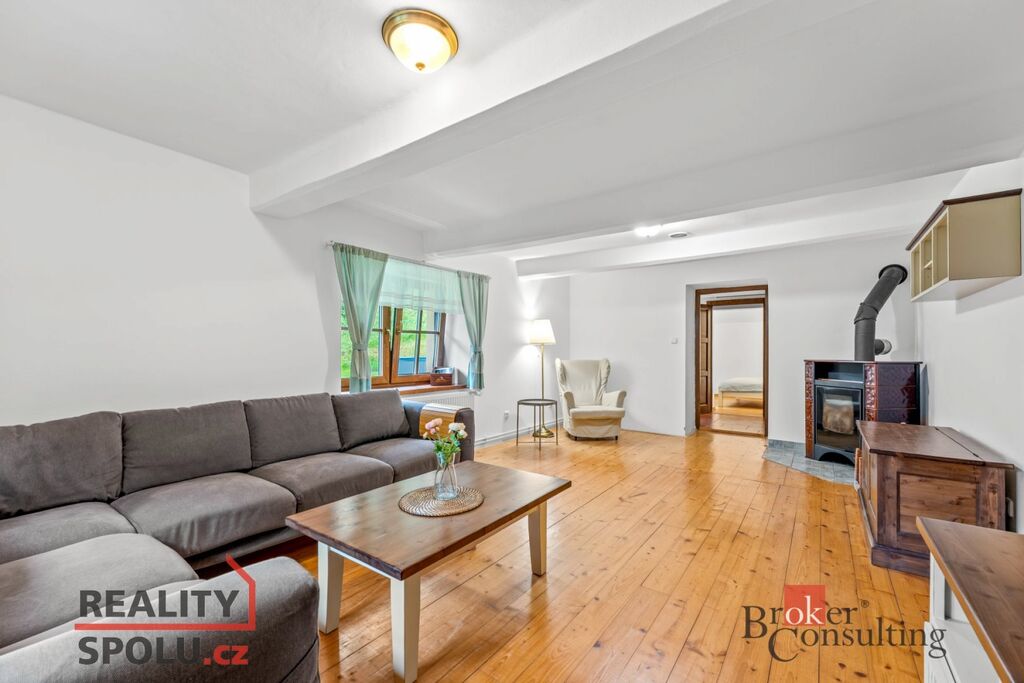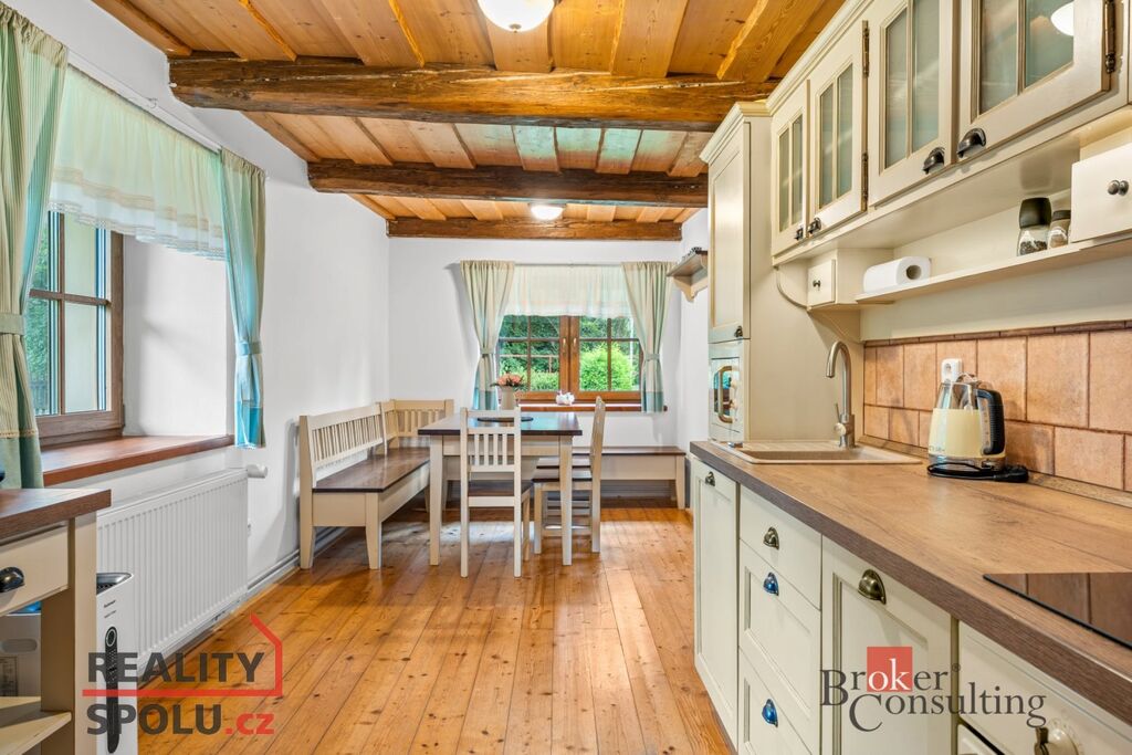 Chalupa o celkové ploše 183,2 m² prošla rozsáhlou rekonstrukcí a je plně vybavena pro komfortní bydlení. V přízemí se nachází prostorný obývací pokoj s kachlovými kamny, pohodlnou sedací soupravou a televizí, kuchyně s moderními spotřebiči včetně myčky, trouby s indukční deskou a kávovaru, dále je tu ložnice, koupelna s odděleným WC a komora. Další ložnice a dva pokoje se nachází v prvním patře, kde je také koupelna vybavená sprchovým koutem a WC, což zajišťuje dostatek prostoru pro rodinu či hosty.