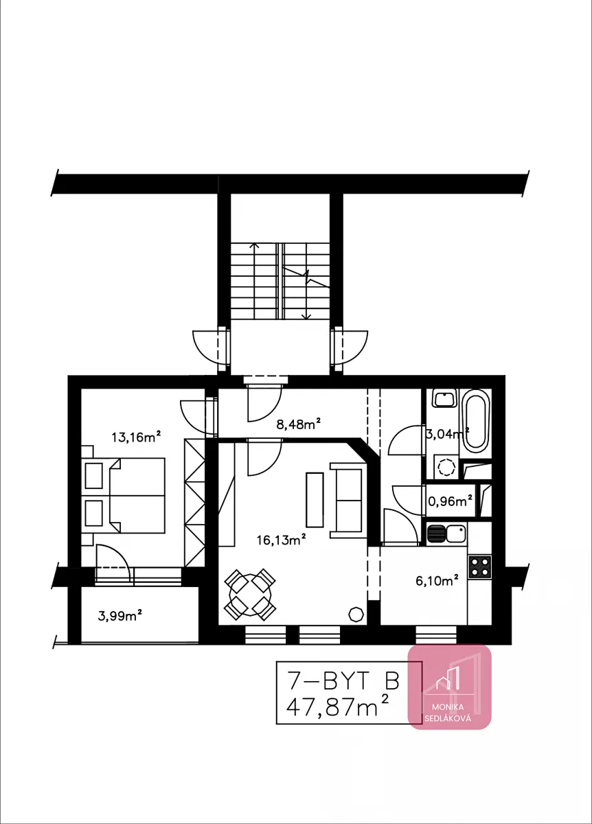 Po vstupu do bytu vás přivítá chodba, ze které se pohodlně dostanete do všech místností obývacího pokoje s průchodem do kuchyňského koutu a ložnice se vstupem na lodžii s jižní orientací. K dispozici je dále samostatná koupelna, oddělené WC a komora. Díky neprůchozím pokojům byt působí velmi prakticky a vzdušně.