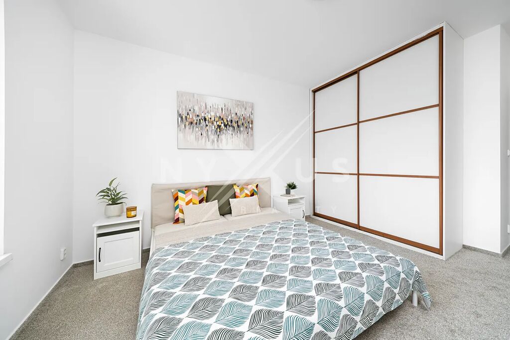 Byt se nachází ve 3. patře domu a jeho dispozice je navržena s ohledem na komfortní bydlení. Z chodby je vstup do komory, koupelny s vanou a toaletou, ložnice a do prostorného obývacího pokoje s kuchyňským koutem, odkud je vstup na slunnou lodžii. Velkou výhodou je sklep umístěný hned na patře vedle bytu, což zajišťuje pohodlný přístup k úložnému prostoru. Součástí bytu je také garážové stání, které je z obou stran chráněno zdí, a poskytuje tak soukromí a bezpečí.