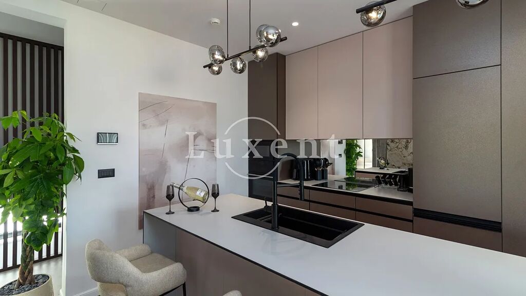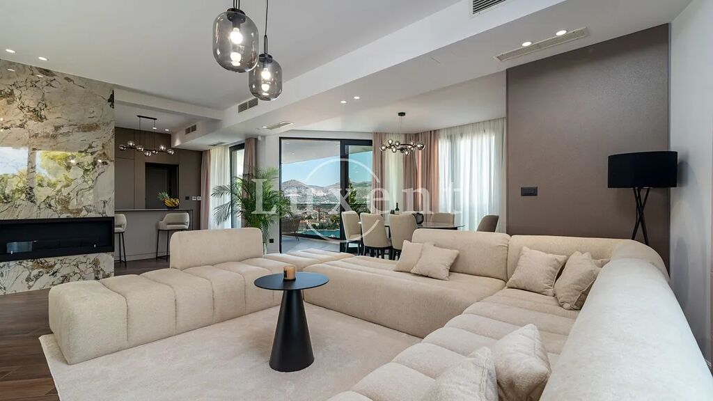 K dispozici je vlastní výtah a kromě garáže nabízí nemovitost také dvě venkovní parkovací místa. Vila vyniká moderním designem, který je umístěn na kaskádovitém terénu, a její dominantou je střešní terasa s bazénem, opalovací částí, krbem, letní kuchyní, odpočinkovou zónou a masážní vanou. Celý objekt je ozeleněný a zdobí ho středomořské rostliny.