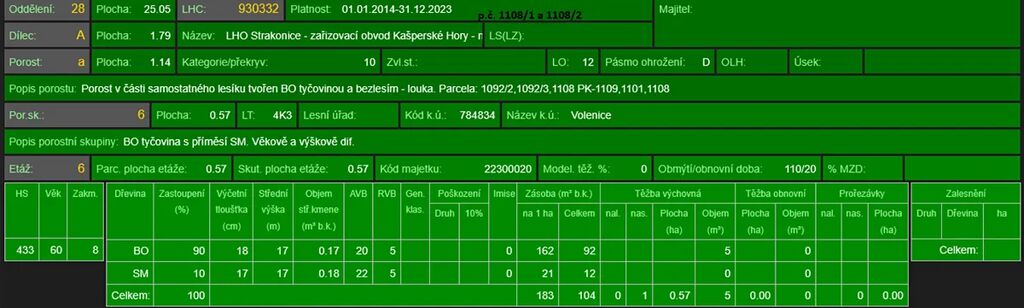 - p.č. 1108/1 vedená jako lesní pozemek o celkové výměře 4 173 m2, vlastníme podíl 1/3 tedy 1 391 m2 (stáří lesa 71 let - hlavní zastoupení dřevin je borovice a smrk),