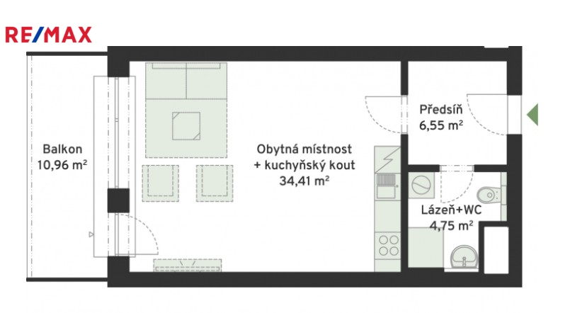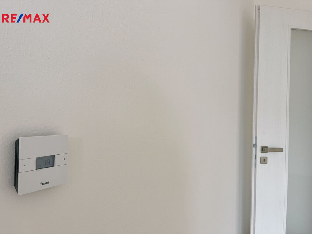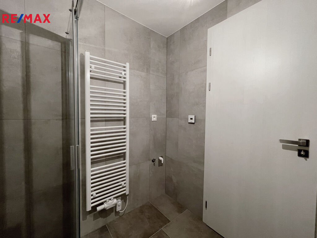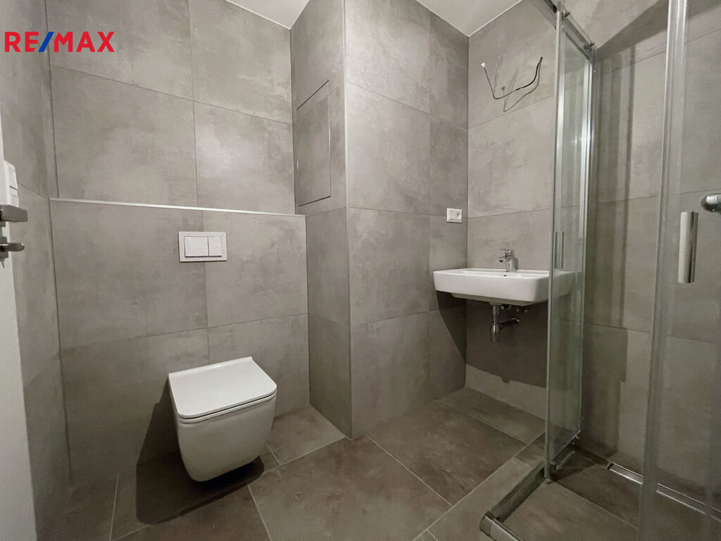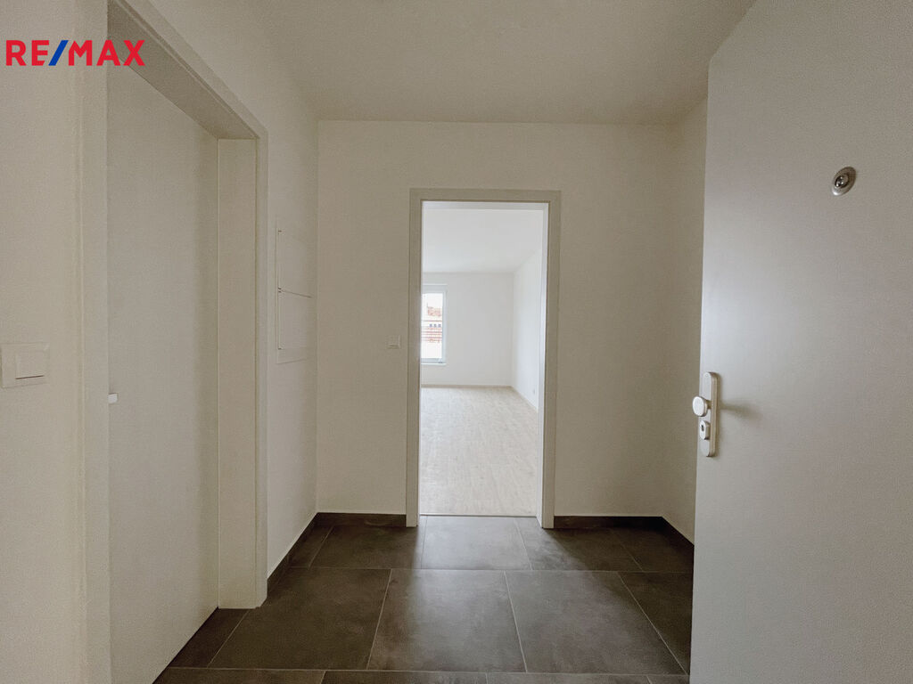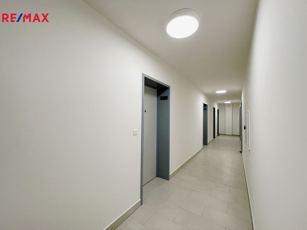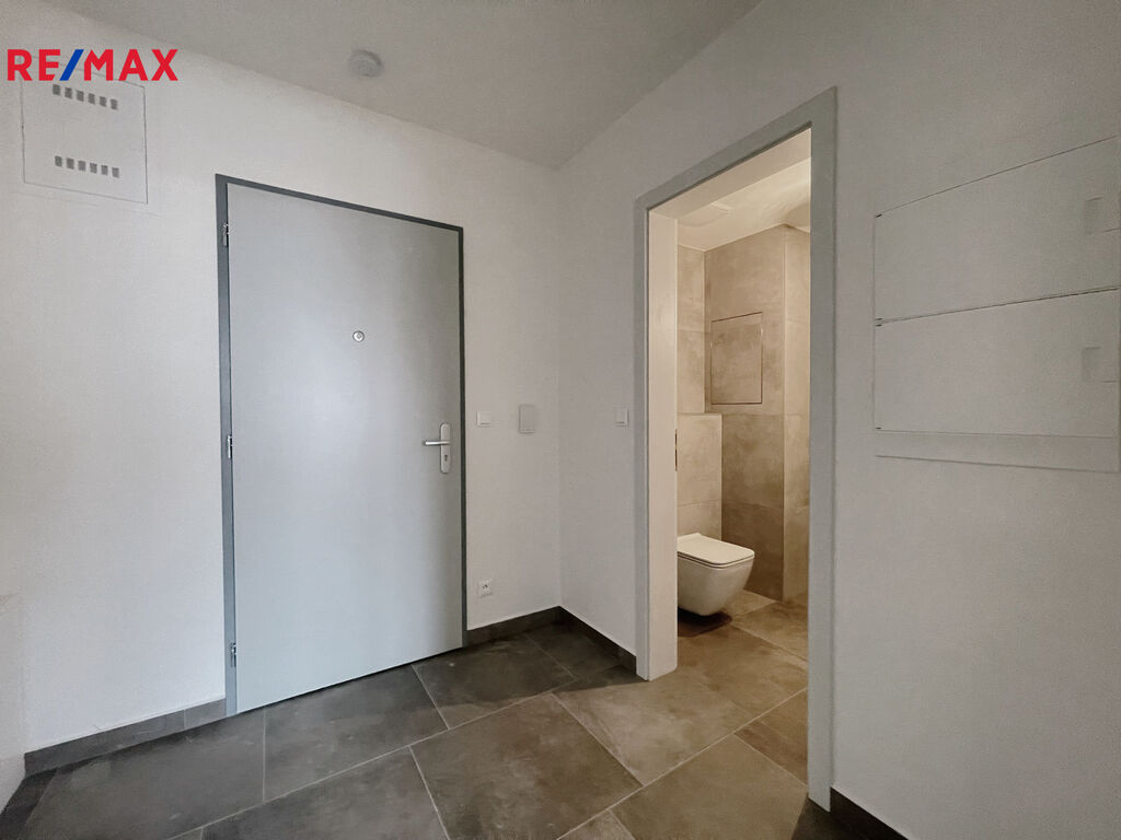 Za vstupními dveřmi se nachází předsíň s místem pro vestavěnou skříň, vlevo koupelna se sprchovým koutem, WC a přípravou na pračku i sušičku. Obytná místnost je připravená na instalaci kuchyňské linky a je z ní přímý vstup na balkon orientovaný do klidné části vnitrobloku.