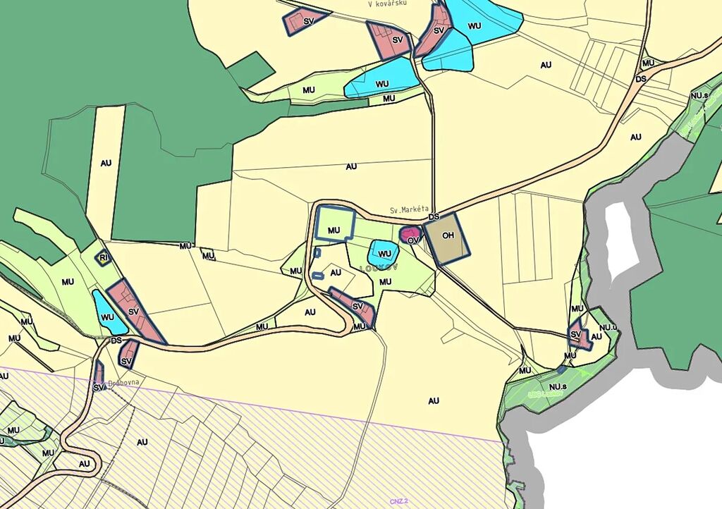 Součástí souboru jsou i parcely o výměře 565 m², které jsou v územním plánu vedeny jako plocha pro smíšené venkovské bydlení. Dále lze předpokládat možnost změny územního plánu na místě původního statku v centru obce, kde se dříve s výstavbou počítalo (nutno projednat s obcí). Na pozemcích se nachází také trafostanice 22 kV, která umožňuje napojení i energeticky náročnějších projektů. Takto ucelených souborů je na trhu minimum, a proto jde o zajímavou investici.
