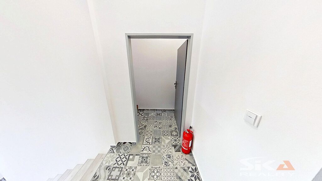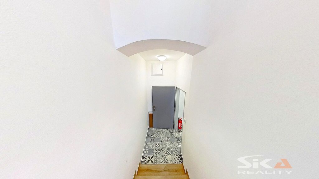 Do domu se vstupuje průjezdem, který propojuje zahradu domu s ulicí Jeronýmova, z průjezdu se vstupuje do prostoru schodiště, kterým lze nastoupat do vyšších poschodí, nebo sejít do prostoru sklepa. Z hlavní podesty v 2.NP je přístupný nabízený byt, součástí jednotky je již rameno schodiště vedoucí do podkroví. Podkrovní byt je koncipovaný jako otevřený obytný prostor s příslušenstvím, prosvětlený vikýřem (v části do ulice) a střešními okny (do uliční části i do zahrady). Po vstupu do prostoru navazuje napravo část s kuchyňským prostorem (kuchyně není osazena) a prostorná koupelna se sprchovým koutem i vanou, společná s toaletou. Ke schodišťové zdi při vstupu do prostoru přiléhá komora, která je umístěna v zešikmené části pod konstrukcí střechy. V původním architektonickém návrhu rekonstrukce domu je počítáno ještě s vybudováním dvou sádrokartonových příček, které v severní části dělí podkrovní prostor, čímž vzniknou další dva pokoje (tyto příčky nejsou realizovány).