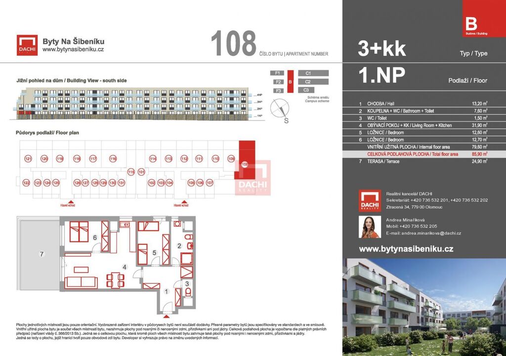 Navazujeme na úspěch první etapy a přinášíme vám jedinečnou příležitost pořídit si nový domov v atraktivním projektu Byty Na Šibeníku. DACHI, prodejce a partner developera, vám v rámci druhé etapy nabízí ke koupi moderní byt 3+kk (č. 108) o ploše 85,9 m s terasou 24,9m. Byt se nachází v 1. nadzemním podlaží nového bytového domu B, který je součástí šestipodlažního objektu se čtyřmi nadzemními a dvěma podzemními podlažími. Ačkoliv se byt nachází v 1. nadzemním podlaží, poskytuje díky terase a dostatečné výšce nad terénem dostatek soukromí.
