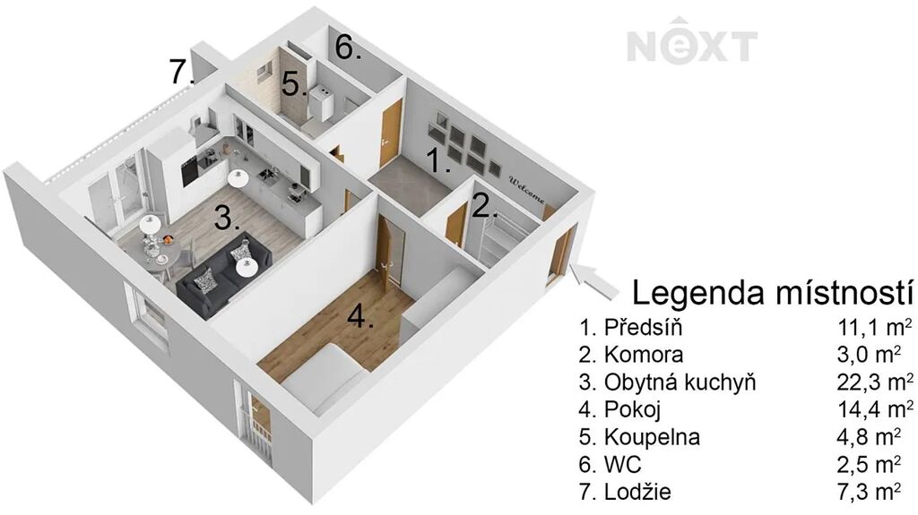 V bytě je dispozici prostorná předsíň (11,1 m2), ze které jsou vstupy do jednotlivých místností - do ložnice (14,4 m2) a do obytné kuchyně (22,3 m2), která současným majitelům slouží jako velmi prakticky jednoduše zařízená kuchyň, ale ve skutečnosti se zde nachází dost prostoru nejen pro kuchyňský kout s jídelním stolem, ale i dost místa pro vytvoření obývací části s pohodlnou pohovkou a konferenčním stolkem. Ranní kávu si za teplých dní můžete vychutnat v lodžii (7,3 m2), která navazuje přímo na tento obytný prostor. Z chodby je dále vstup do koupelny (4,8 m2) s umyvadlem a vanou, na samostatné WC (2,5 m2) a do komory ( 3 m2).