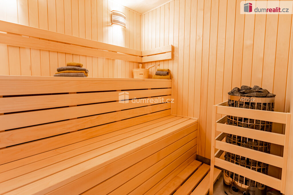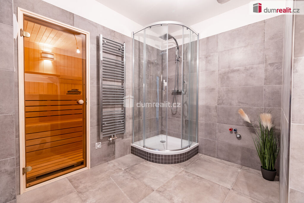 Přízemí se skládá ze vstupní chodby, z které je přístup do garáže, technické místnosti s šatnou na zimní věci a boty, dále z garáže do místnosti pro posilovnu, sauny s wc a sprchovým koutem. Je zde i úložný prostor pod schody, které vedou do 1. patra do vzdušného a velmi prosvětleného obývacího pokoje, s jídelní částí a kuchyňským koutem, wc, koupelnou se sprchovým koutem, ložnicí a malou šatnou.