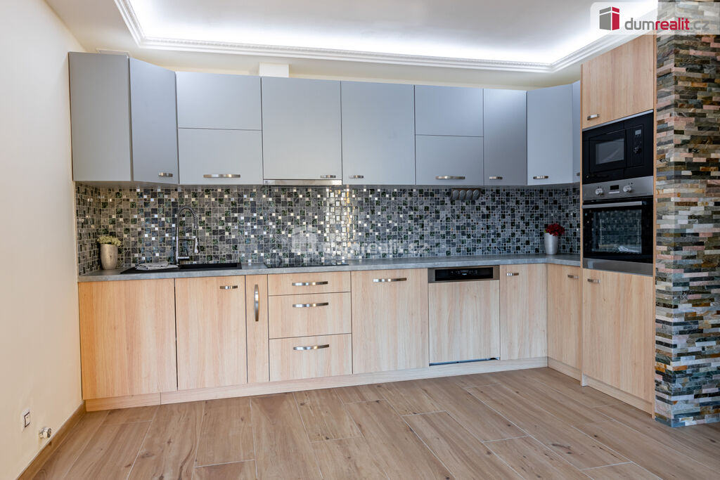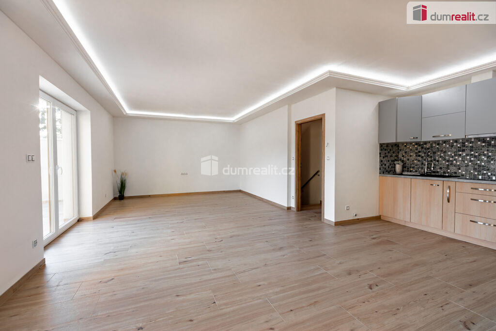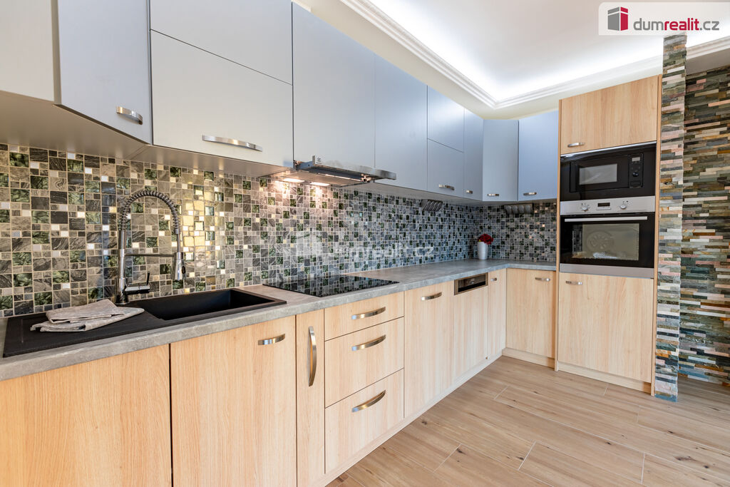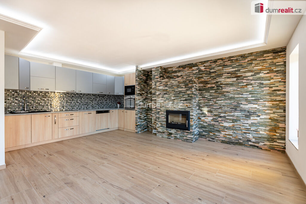 Kuchyně je zařízená moderní kuchyňskou linkou, v obývací části krb.