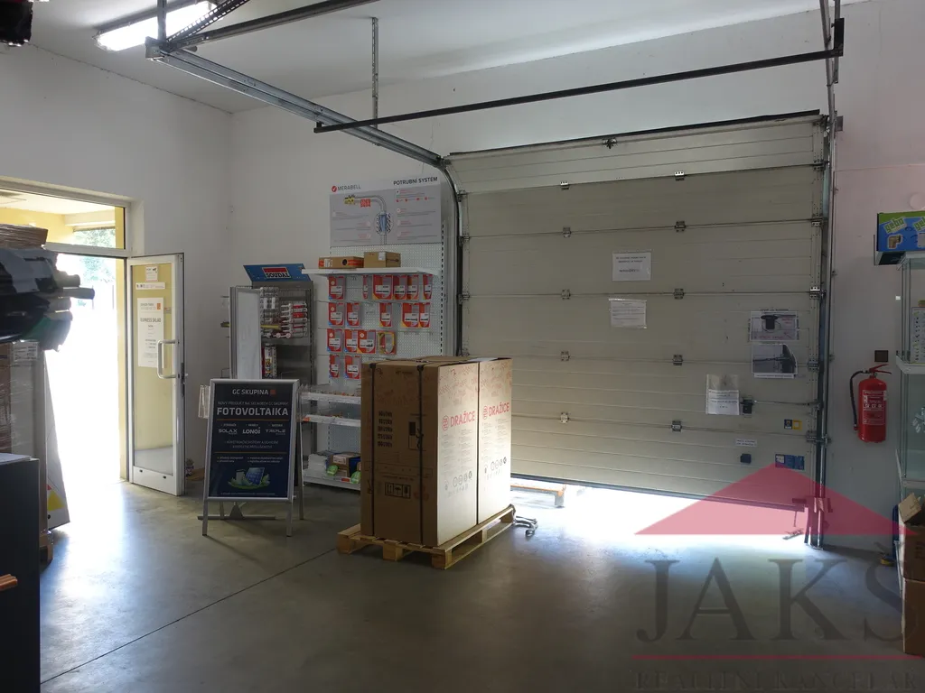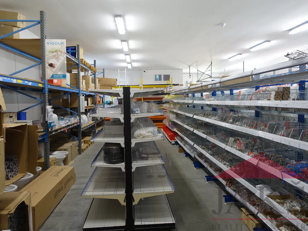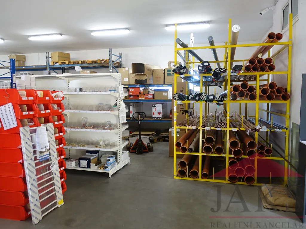 Popis: skladovací hala (dvoje vrata o šířce 2,4 a 2,7 m) o velikosti 182,46 m2 s rozměry 10,2 m x 16,7 m + 2,5 m x 4,2 m a výškou 3,7 m, prodejna či kancelář 35,9 m2, chodba 7,4 m2, sociální zařízení 2,94 m2 (WC, umyvadlo) a denní místnost 6,88 m2 (kuchyňka, sprcha, šatna).