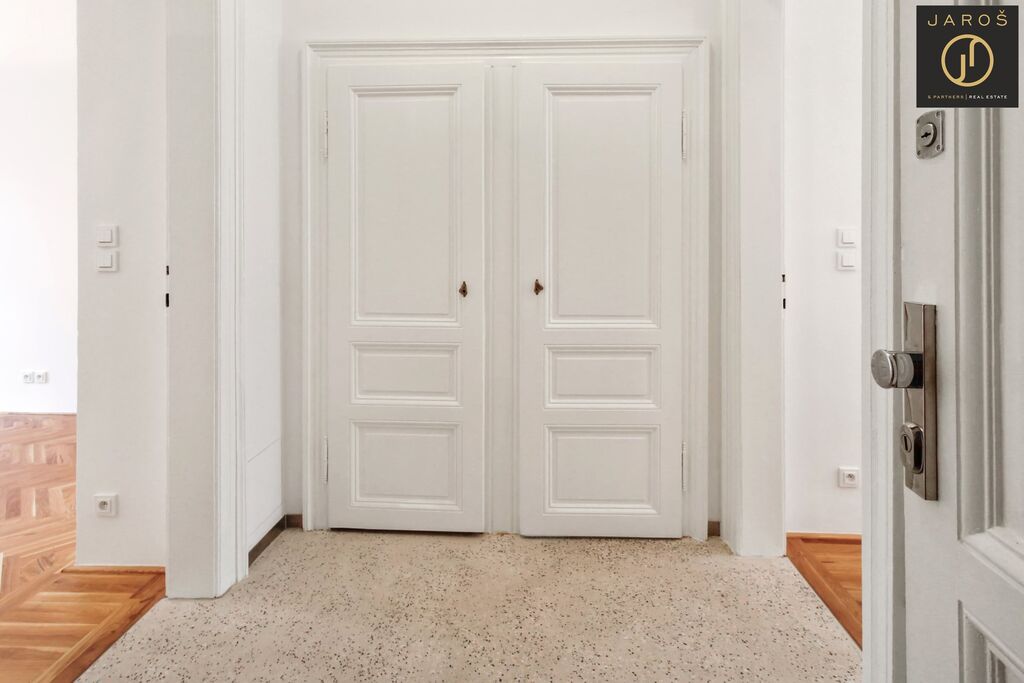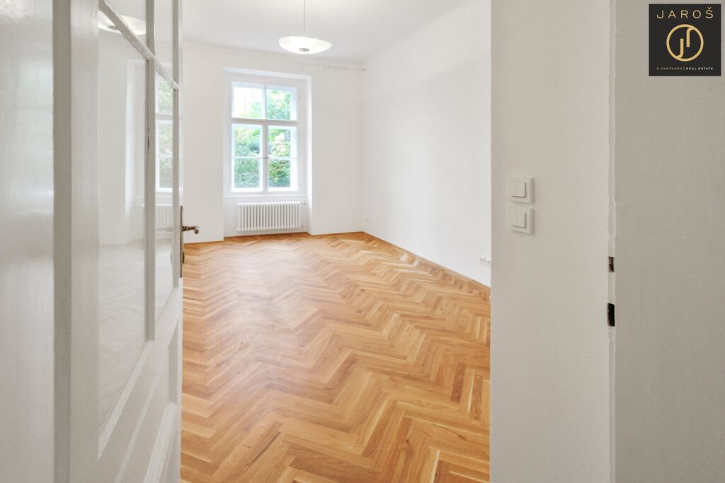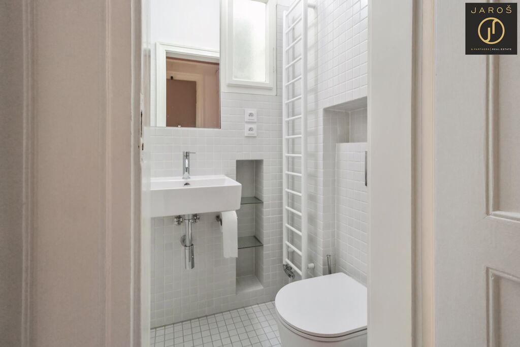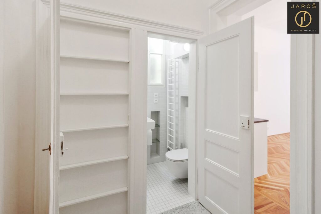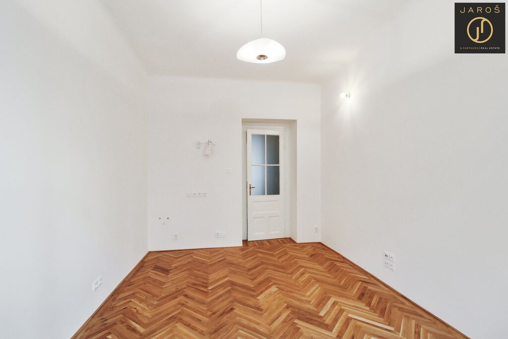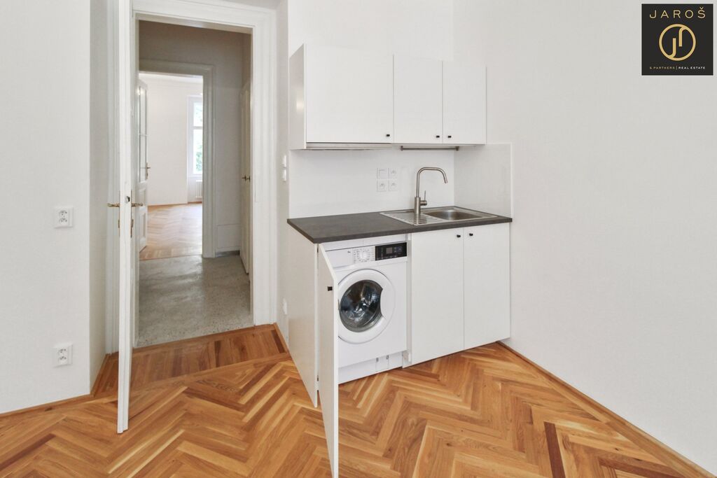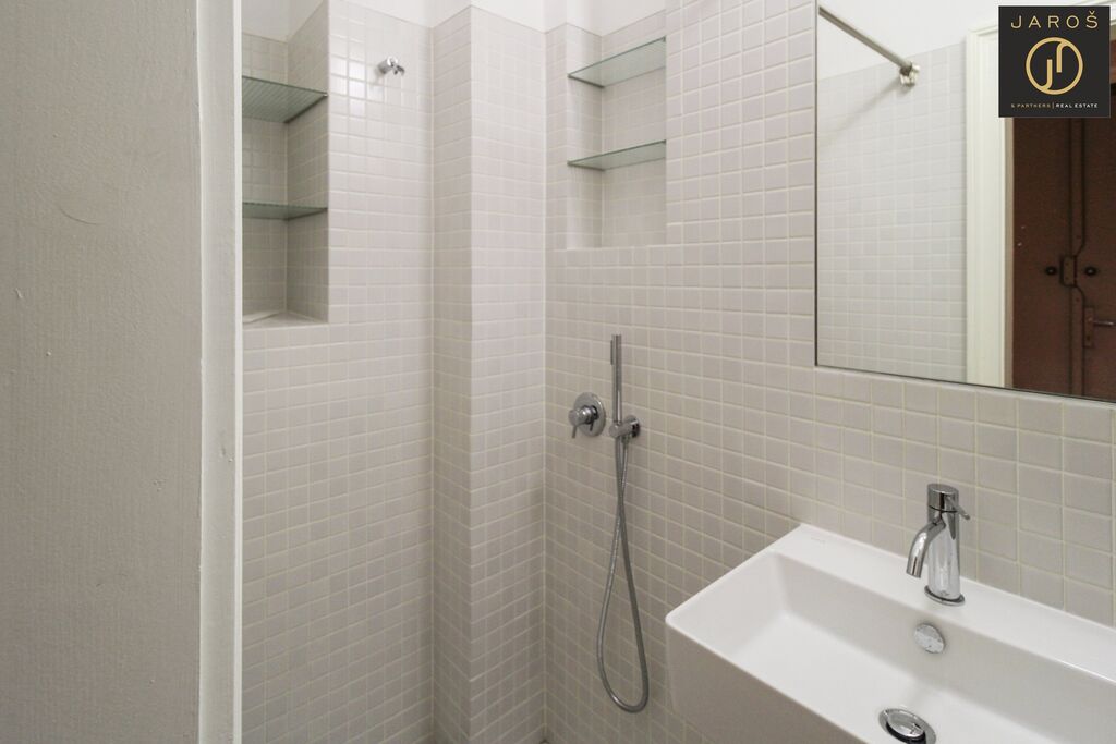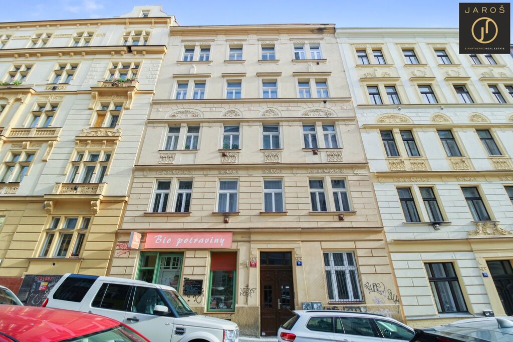 Nabízíme Vám k pronájmu světlý byt s dispozicí 2+kk (možno rozdělit na dvě samostatné jednotky se sdílenou koupelnou s wc) o celkové výměře 44m2 v oblíbené a klidné lokalitě Praha – Vršovice po celkové citlivé rekonstrukci (ulice Na Spojce). Byt o celkové výměře 44 m2 se nachází v prvním patře historického cihlového domu s vysokými stropy, 2 min od zastávky tramvaje (22,4,13), dále 2 zastávky od metra nám. Míru. Je po celkové rekonstrukci (stoupačky, zrenovovaná špaletová dřevěná okna a původní dveře, kompletně nová koupelna, zcela nové povrchy, nová parketové dubová podlahy v pokojích, původní doplňky, svítidla). Byt je základně vybavený a připravený k nastěhování. Ložnice má okno do zeleného vnitrobloku a je zde udělaná příprava rozvodů pro umístění případné druhé kuchyňské linky. V pokoji do ulice je umístěná kuchyně se základním vybavením (vestavěná pračka a digestoř, dřez, úložné prostory). Byt lze tedy užívat i s oddělenými pokoji s kuchyněmi a společnou koupelnou a halou. Pokoje nejsou průchozí a ústí do společné haly, z které je vstup do koupelny s wc a sprchovým koutem. V bytě jsou využity prostory pro ukládání potřeb v koupelně a hale. V pokojích jsou pod okny umístěny nové radiátory, v koupelně a hale je podlahové vytápění a otopný elektrický žebřík. V koupelně je dále plynový kotel nad wc. Ve všech prostorech jsou osvětlovací tělesa.