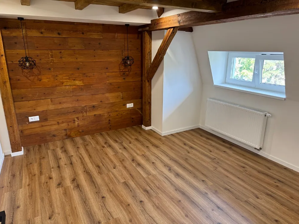 Byt je čerstvě po rekonstrukci z bývalého nevyužívaného půdního prostoru.