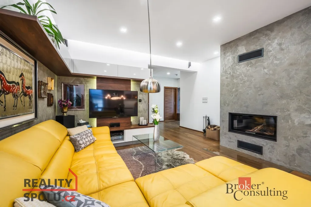 Z levé části chodby se vstupuje do prostorného obývacího pokoje propojeného s kuchyní. Dominantou obývací části je designový krb zasazený do stěny s elegantní betonovou stěrkou, který dodává světlému interiéru hřejivý kontrast. V kombinaci s dřevěnou podlahou, dřevěnými okny a přímým vstupem na zahradu vzniká útulná a sofistikovaná atmosféra. Kuchyň je velkorysá, vybavená moderní linkou s vestavěnými spotřebiči a poskytuje příjemný výhled do přední části domu.