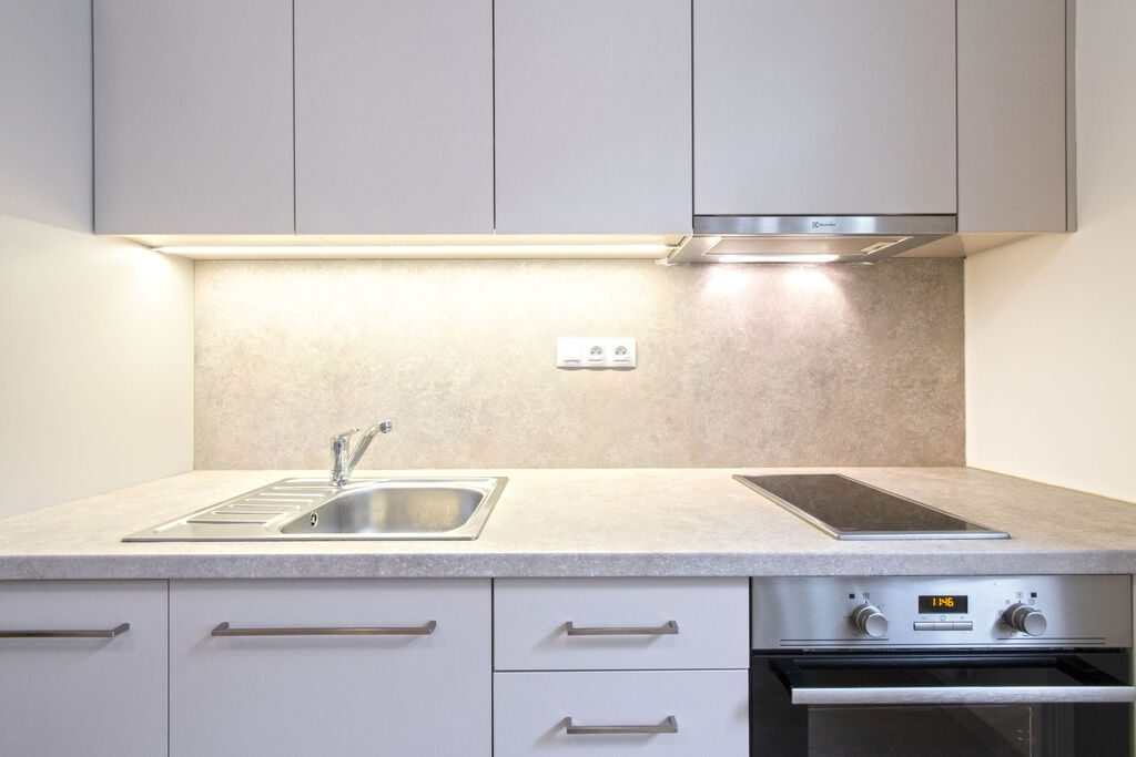 Byt se nabízí částečně vybavený. Kuchyňská linka disponuje lednicí, sklokeramickou deskou, troubou a digestoří. Obývací část je dále nezařízená. V moderní koupelně najdeme sprchový kout, umyvadlo a toaletu.