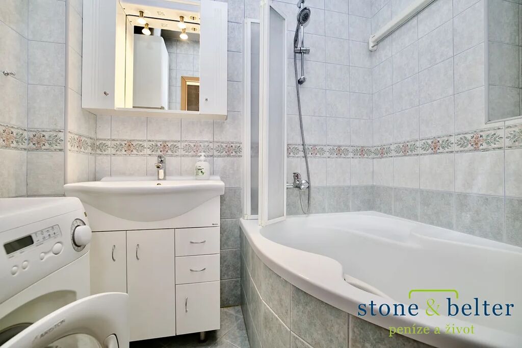 Koupelna: rohová vana a pračka.
