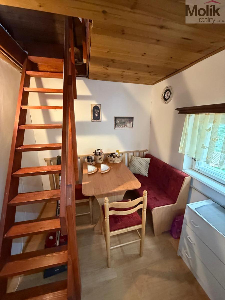 V přízemí chaty se nachází koupelna s toaletou, obývací pokoj a kuchyně, v patře pak dva útulné pokoje.
