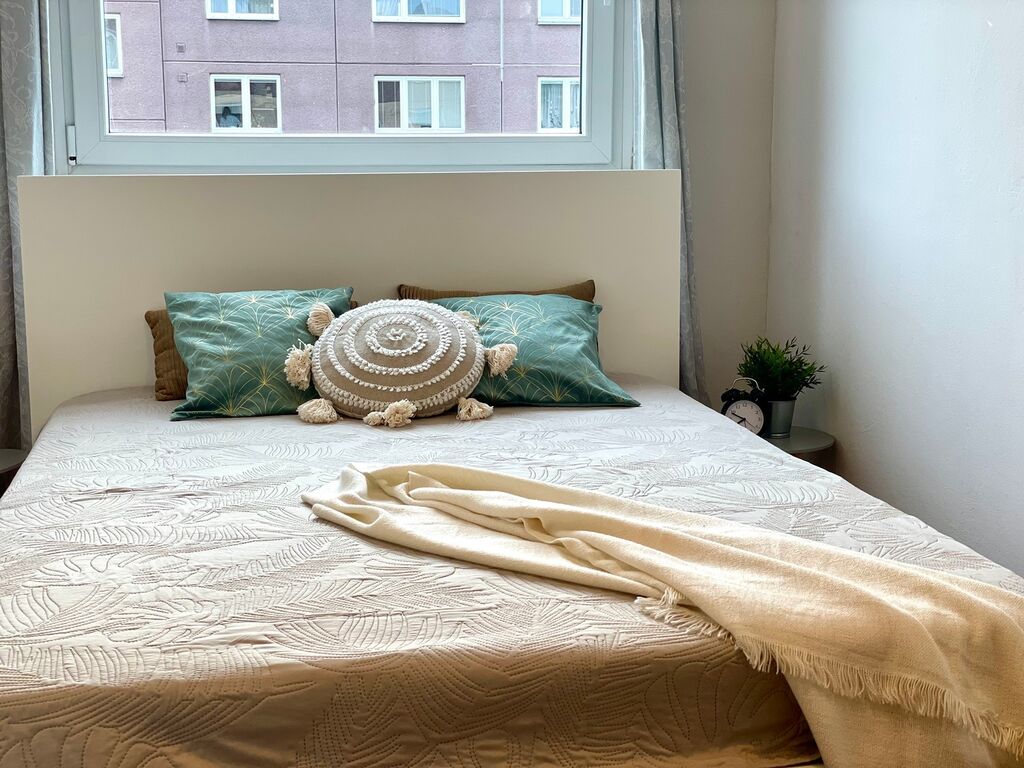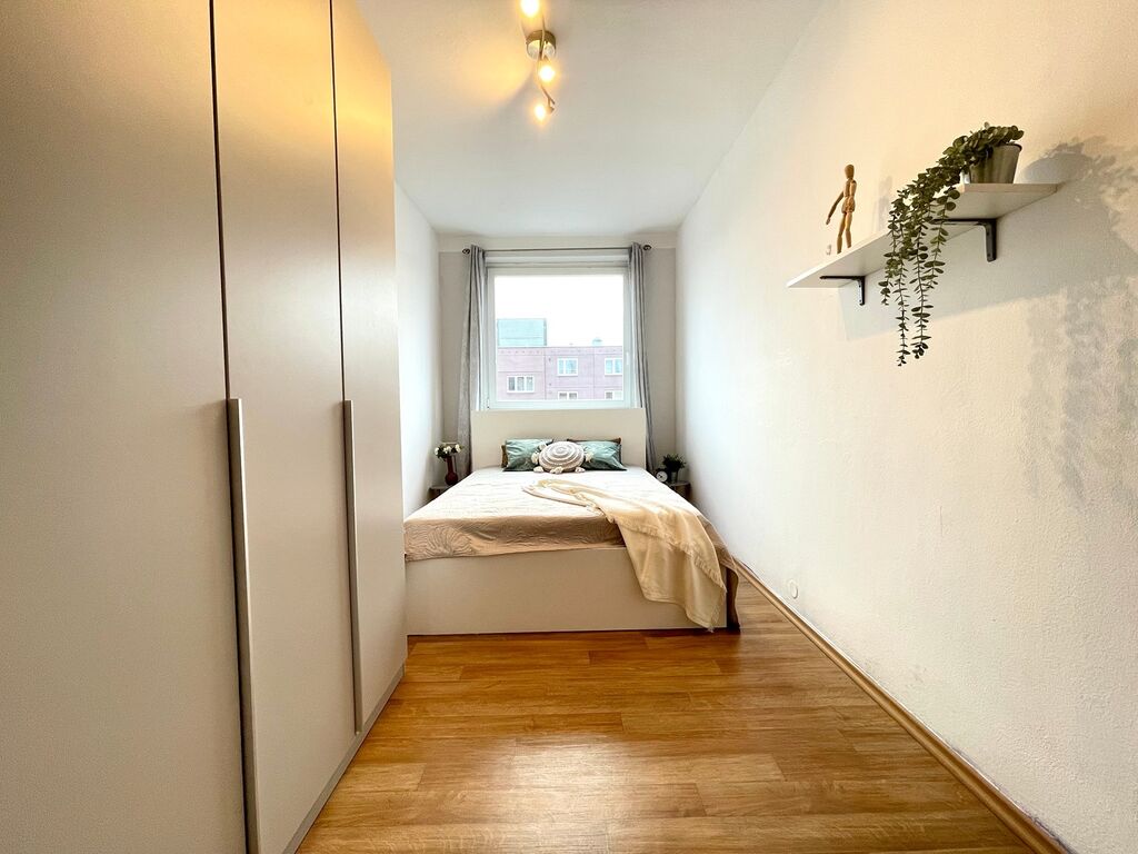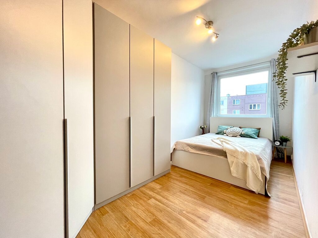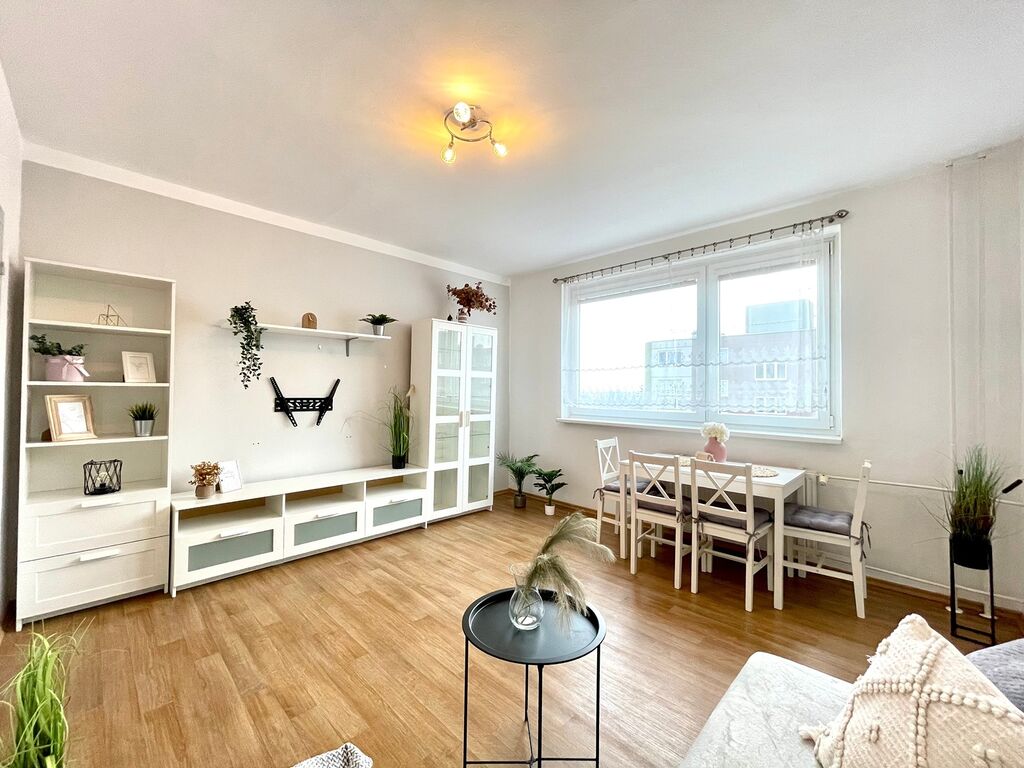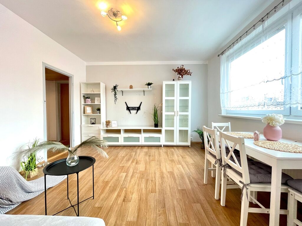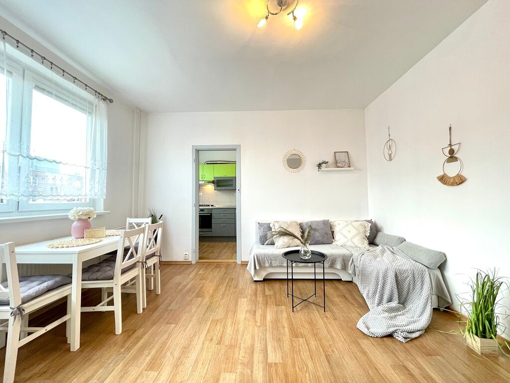 Kuchyně je vybavená kuchyňskou linkou s plynovým sporákem a troubou, digestoří, lednicí, což zajišťuje plný komfort při vaření. V prostorném obývacím pokoji nechybí rohová sedačka, obývací stěna a pod okny najdete jídelní stůl, vše v bílém Scandi stylu. V ložnici se nachází velká vestavěná skříň a postel. Vstupní chodba s velkým zrcadlem a stropním úložným prostorem, Vás přivítá příjemnou atmosférou. Z chodby máte přístup do ložnice, obývacího pokoje a koupelny. Koupelna je vybavena sprchovým koutem, pračkou, skříňky a příčkou částečně oddělené WC.