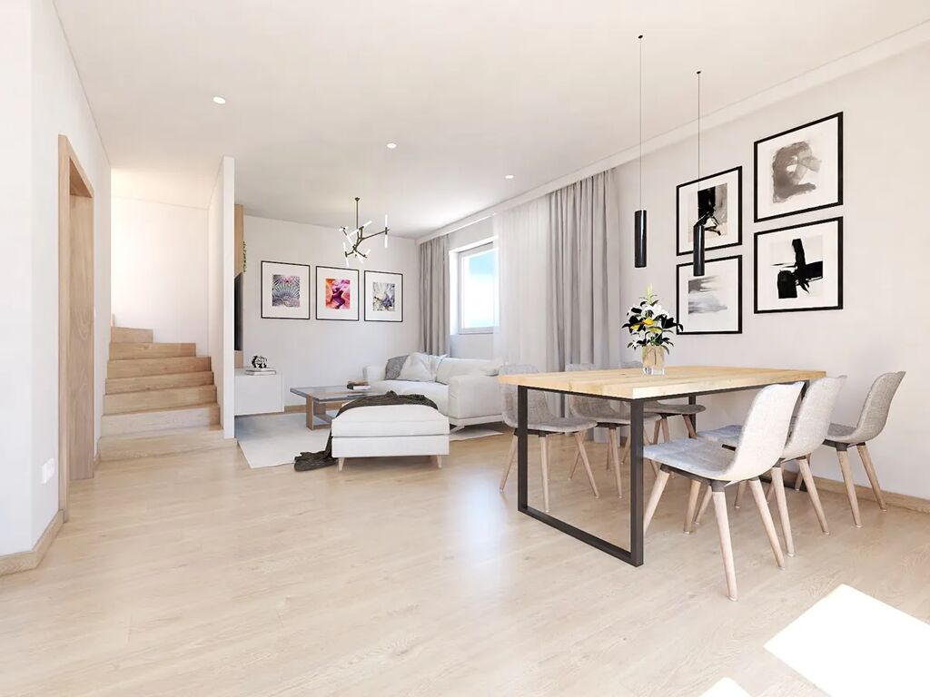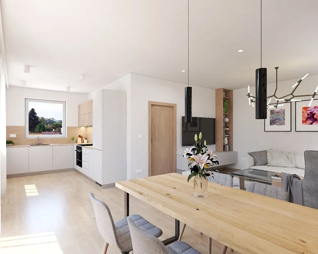Dispozice domu je navržena s ohledem na potřeby moderní rodiny. Přízemí nabízí otevřený obytný prostor s kuchyní, vstupem na zahrádku a praktickým zázemím. V patře se nachází ložnice a další obytné místnosti, které poskytují dostatek soukromí. Samozřejmostí je vysoký standard provedení – podlahové vytápění, předokenní rolety, příprava na klimatizaci a možnost výběru z kvalitních vinylových podlah, obkladů i interiérových dveří.