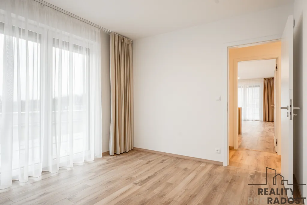 Moderní kuchyňská linka je vybavena elektrickou troubou, varnou deskou, lednicí s mrazákem, myčkou a mikrovlnkou. Kuchyně poskytuje dostatek úložného a pracovního prostoru. Z obývacího pokoje a jedné ložnice se vchází na prostornou terasu, která je orientovaná na východní stranu s výhledem do zeleně. Velká okna v bytě poskytují dostatek světla a hezký výhled do otevřeného prostoru. Na oknech jsou instalovány venkovní žaluzie na dálkové ovládání. Podlahy jsou vinylové, v koupelně je umístěná pračka.