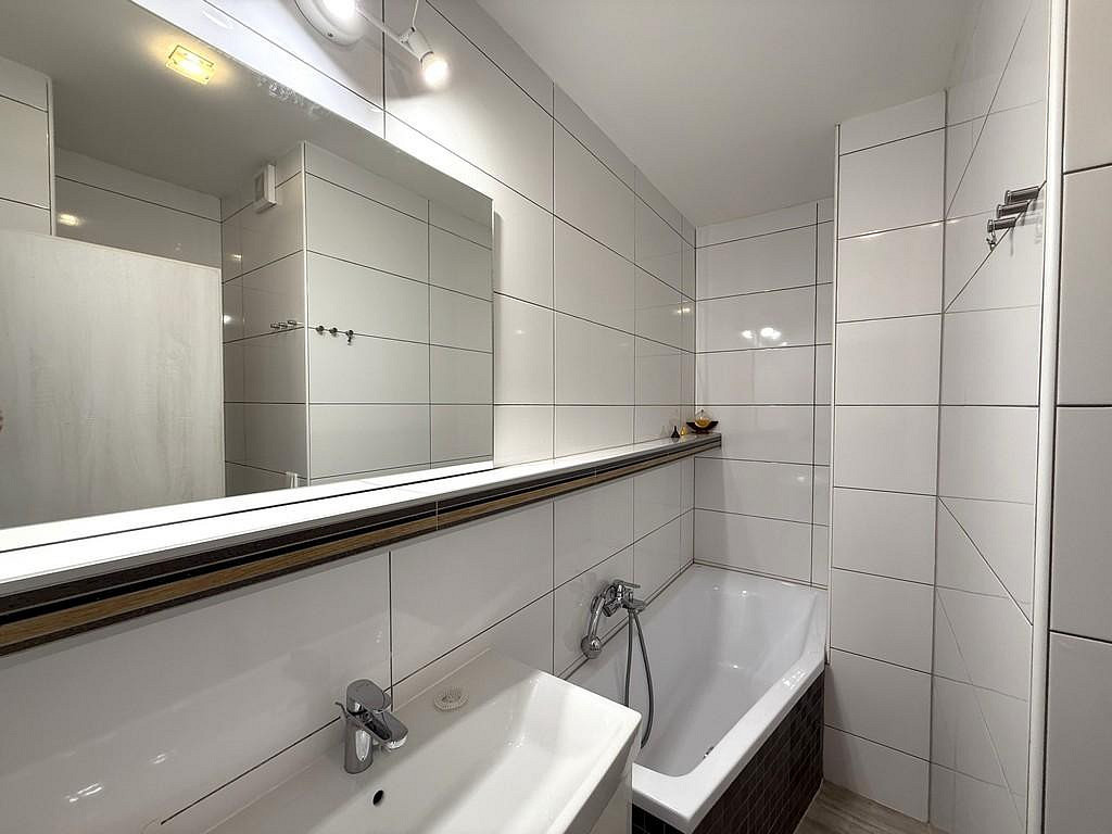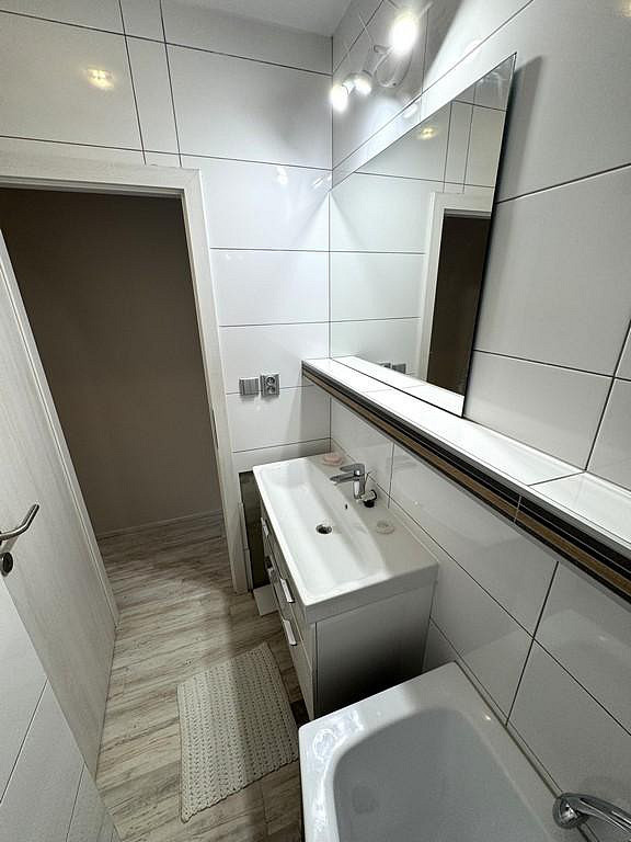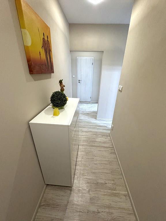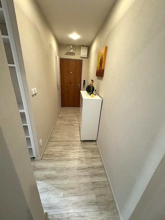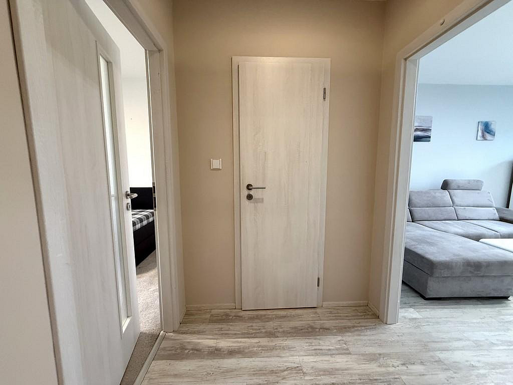Bezpečnostními vstupními dveřmi vejdeme do prostorné chodby ve tvaru L, jejíž výměra činí cca 5,61 m². V bytě je samostatné WC s umyvadlem o výměře cca 1,25 m². Koupelna je nádherná, je zde umyvadlo, vana, pračka a samotná místnost působí velmi příjemným a útulným dojmem. Celková plocha koupelny činí cca 3,21 m². Kuchyně je moc pěkná, nachází se v ní nová kuchyňská linka s troubou, sporákem, mikrovlnnou troubou, myčkou a lednicí s mrazákem. Je zde také stůl se židlemi. Celková plocha kuchyně činí cca 9,32 m². Obývací pokoj je vybaven velmi vkusným nábytkem do světlých barev. Je zde rohová sedačka, konferenční i televizní stolek, skříňka. Celková plocha obývacího pokoje činí cca 14,74 m². Do obývacího pokoje je vstup buď z kuchyně nebo z menší haly vedoucí do šatny a ložnice. Celková plocha menší čtvercové haly činí cca 2,73 m². Tato plynule navazuje do vstupní chodby. Z haly je vstup do místnosti, která nyní slouží jako ložnice. Tato je vybavena skříní se zrcadlem, sedačkou, stolkem a židlí. Dominantou této místnosti je příjemný a prostorný balkon o výměře cca 3,17 m². Ložnice má výměru cca 14,50 m². Z již uvedené haly je vstup také do prostorné šatny s regály, jejíž výměra činí cca 2,70 m².