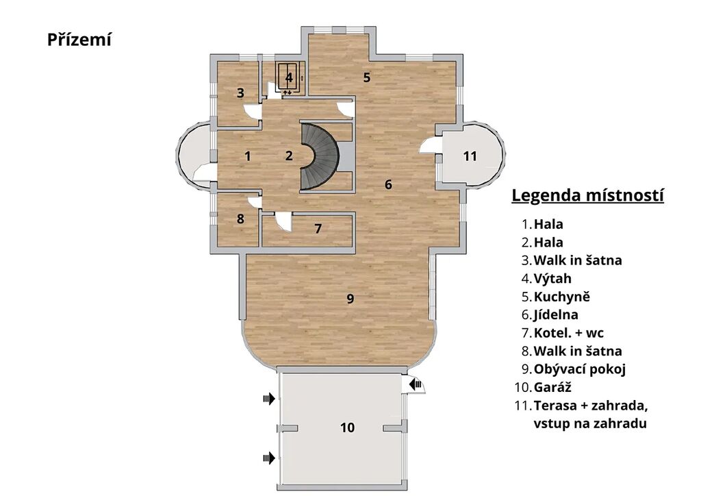 • Přízemí o ploše 142m2 : Prostor, kde se snoubí rodinné momenty v obývacím pokoji a hostiny v jídelně, nebo přímo v krásné a udržované zahradě. Kuchyň, technická místnost a velkorysé šatní prostory zajišťují maximální funkčnost.