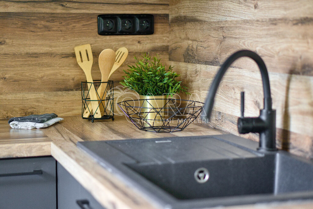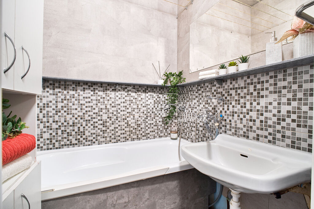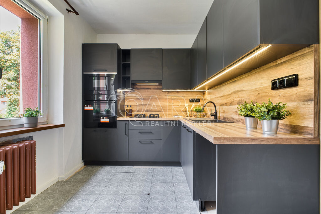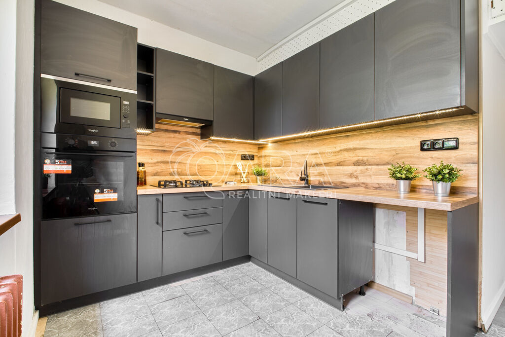 Rohová kuchyňská linka s vestavnými spotřebiči. Koupelna prošla částečnou renovaci.