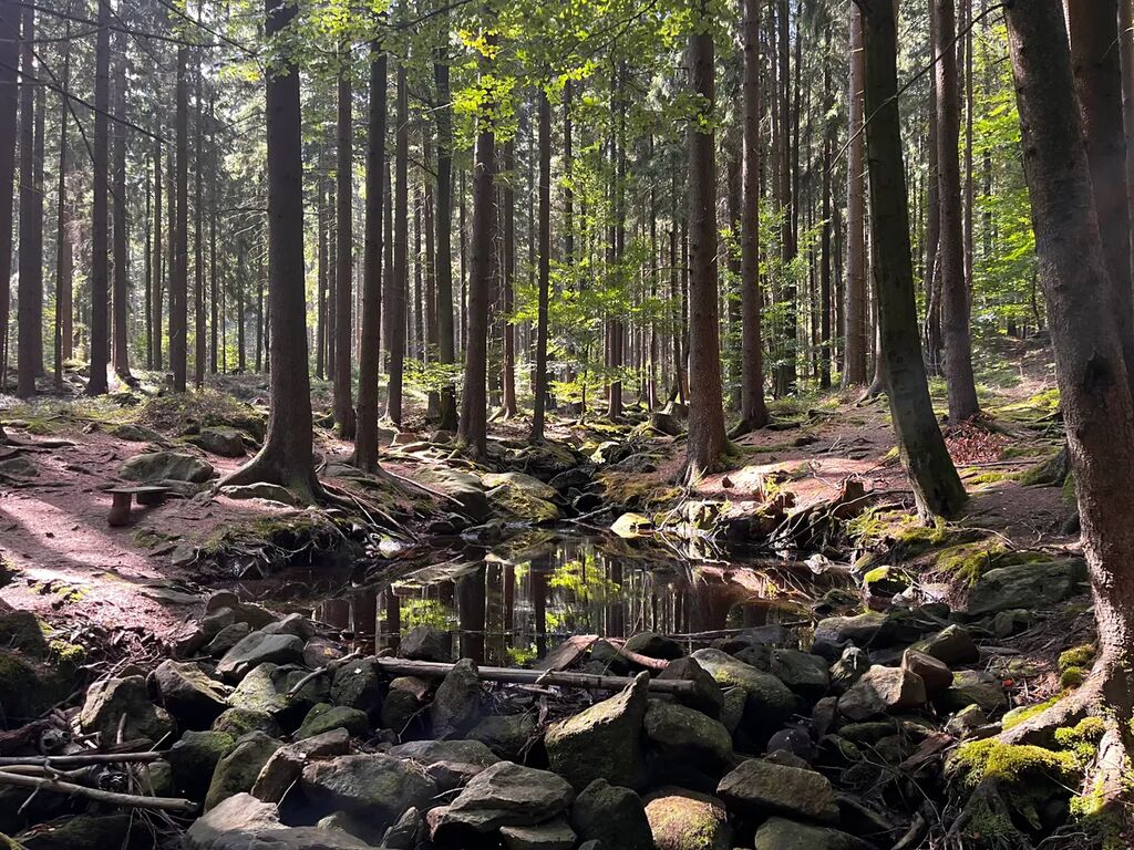 "Šumění listí, šumění větví jehličnanů ve větru, šumění pramene sytícího rybníček."