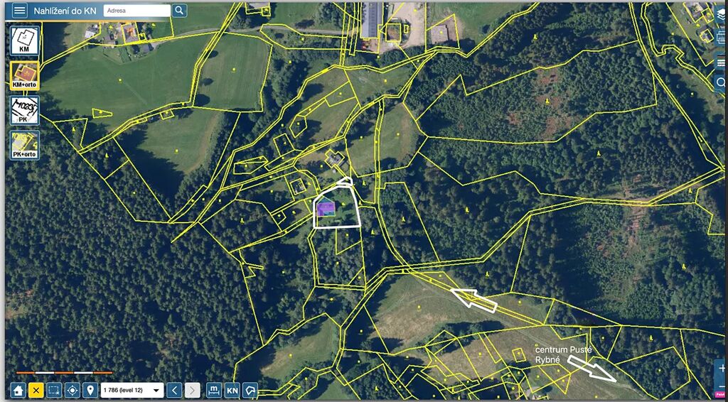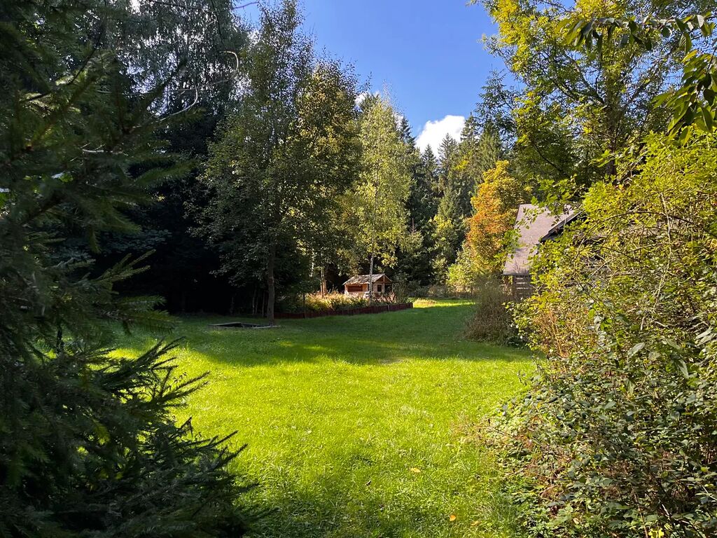 1664 m2 travnatého pozemku vč. zastavěné plochy. K tomu se nabízí 1/2 pozemku trvalý travní porost (se vzrostlými náletovými dřevinami) o ploše 2136 m2 (není uveden v zákresu ve fotogalerii, ale na pozemky kolem chalupy navazuje).