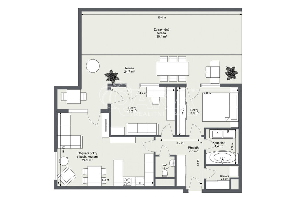 V ceně bytu jsou navíc zahrnuty vestavěné skříně na míru, koupelnový nábytek i kompletní osvětlení.
