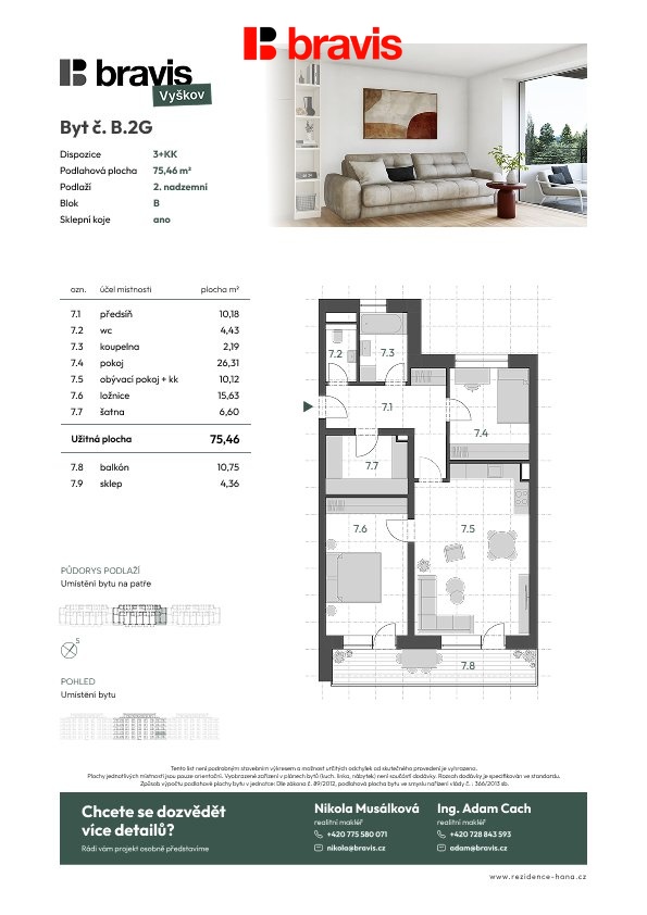 Ke komfortu bydlení přispívají také balkon o rozloze 10,75 m² a sklepní kóje 4,36 m², která je součástí kupní ceny.