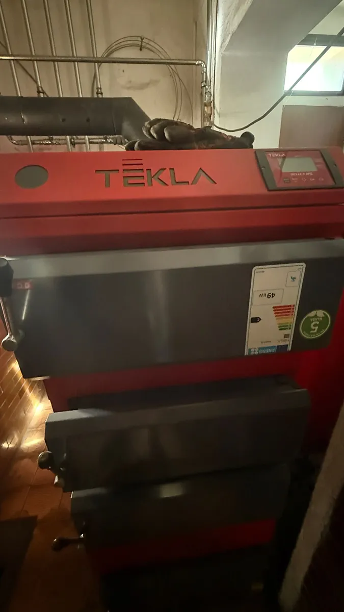 Automatický kotel na tuhá paliva (2020) + letní elektrický bojler, v bytě v přízemí krbová kamna.