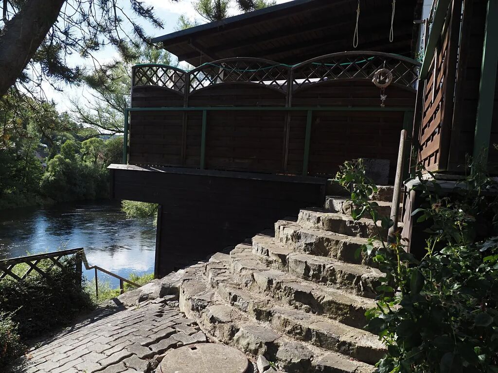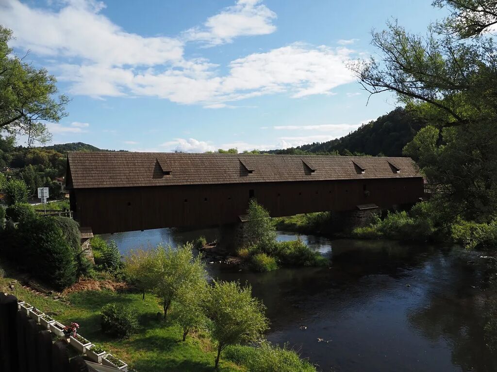 Prostornou částečně zastřešenou terasu s výhledem na řeku a historický dřevěný most