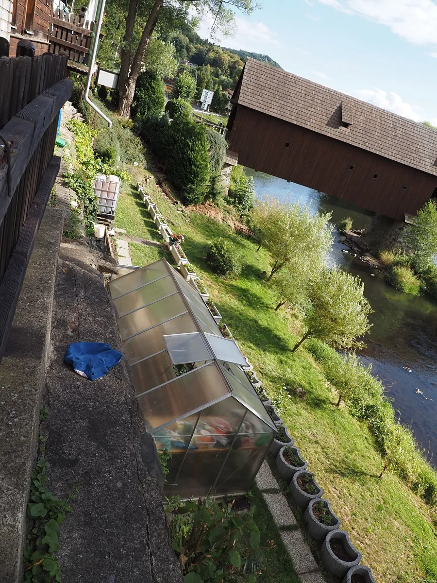 Pozemek 965 m² s rovinatou i mírně svažitou částí, vlastní zahradní domek, skleník, ohniště u řeky a možnost parkování