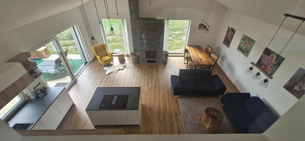 Stavba je provedena z kvalitních tvárnic Porfix a je velmi dobře zateplena – celková tloušťka izolace činí 16 cm. V přízemí domu se nachází prostorná vstupní chodba, technická místnost s kotlem, koupelna se sprchou a toaletou, dále jeden pokoj, ložnice a velký obývací prostor s kuchyní a jídelnou. Z obývacího pokoje je přímý vstup na terasu s výhledem do okolí.