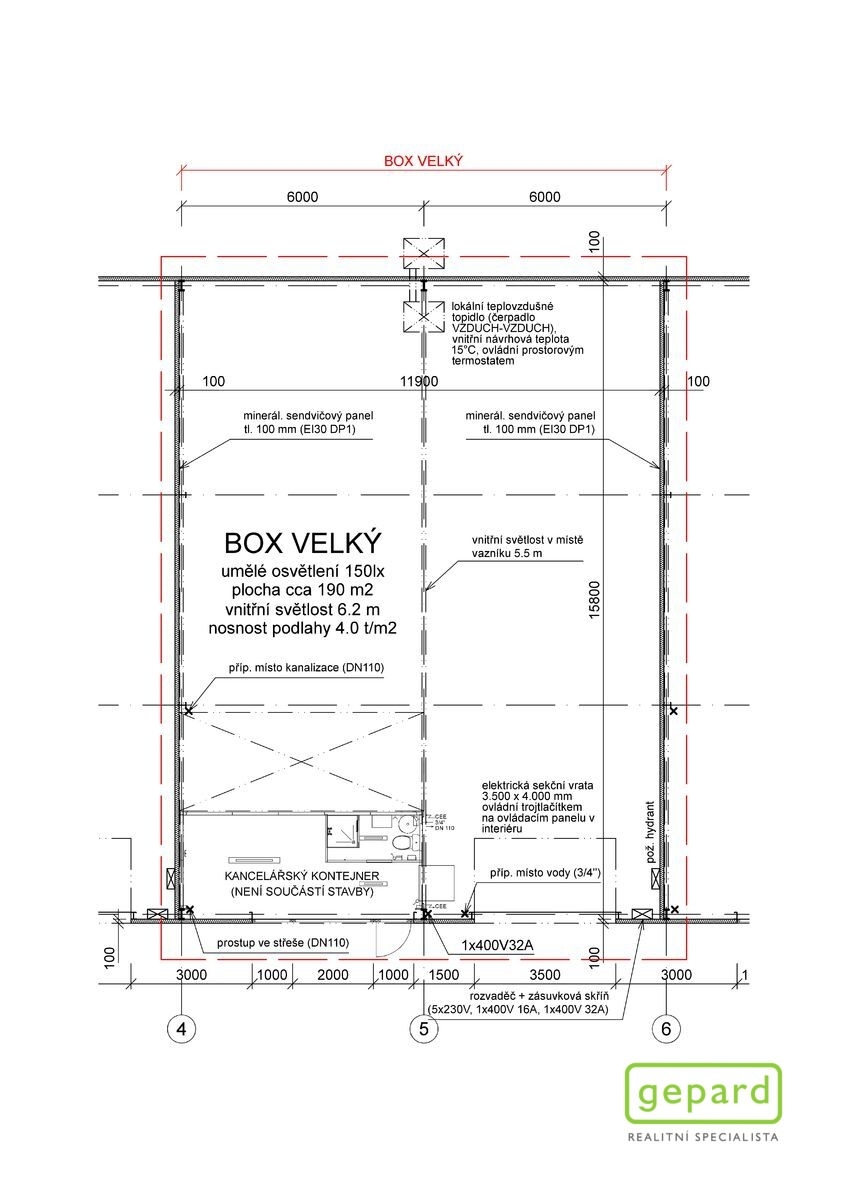 - 1x zásuvka 400V 32A (příprava při připojení kancelářské buňky)