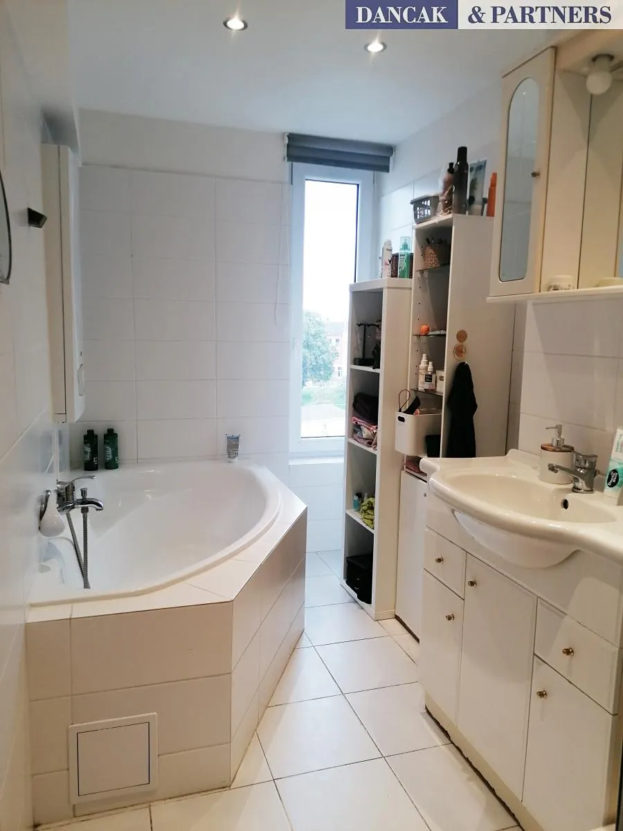 Byt sestává z prostorného obývacího pokoje, který navazuje na kuchyň s vybavenou kuchyňskou linkou (sporák, myčka, lednice), kuchyňským stolem a židlemi, dále je zde ložnice, dětský pokoj (pracovna), koupelna s vanou, sprchovým koutem, koupelnovým nábytkem, samostatné WC a komora pro umístění pračky a sušičky.