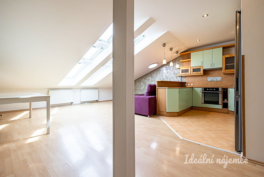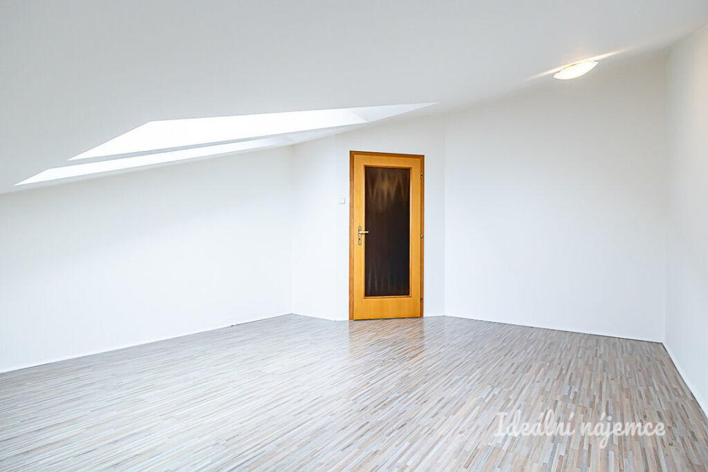 K dlouhodobému pronájmu nabízíme prostorný atypický, částečně zařízený podkrovní byt 4+kk o výměře 116 m2 ve 3. patře menšího bytového domu v klidné rezidenční lokalitě pražské Vinoře. K bytu náleží garážové stání v přízemí domu.