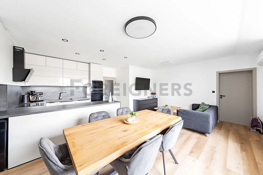 • Prostorný obývací pokoj s moderní kuchyní a vstupem na terasu