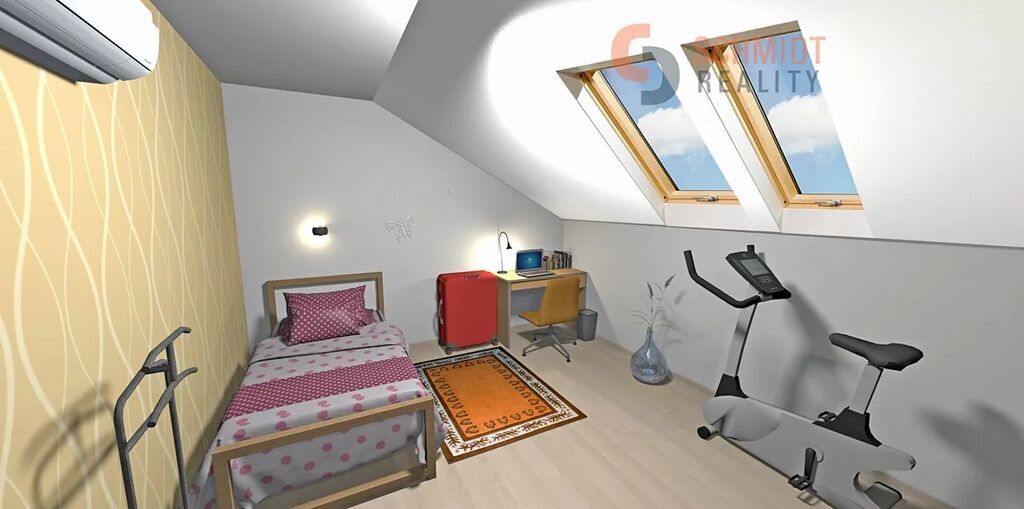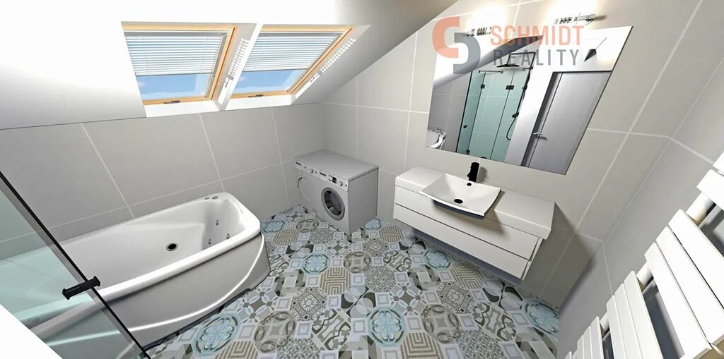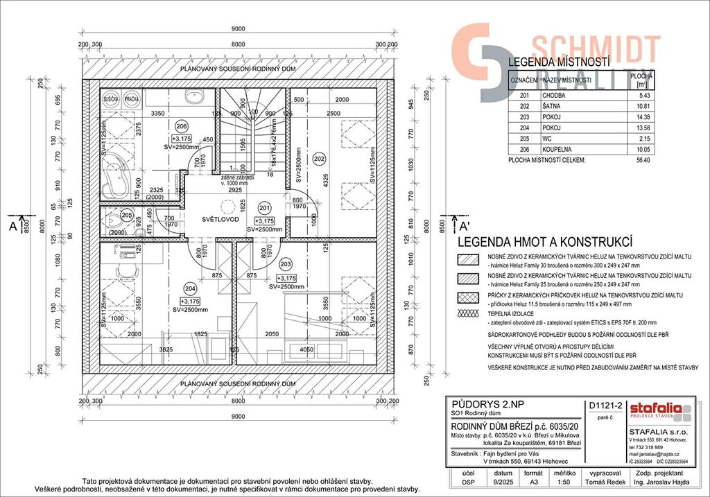 Druhé nadzemní podlaží tvoří tři pokoje, koupelna (vana, sprcha), a wc samostatně.