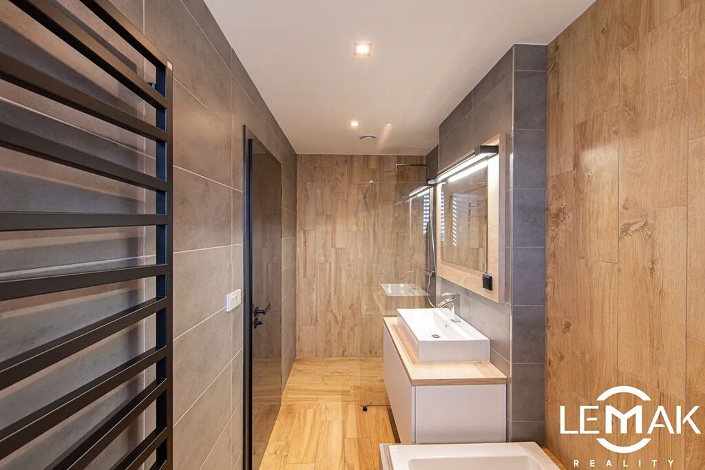 Dům je postaven s využitím monolitických stropů a celkově disponuje podlahovým vytápěním, což přispívá k rovnoměrnému a příjemnému teplu v celém domě. K nemovitosti náleží také dvě parkovací místa a zahrada.
