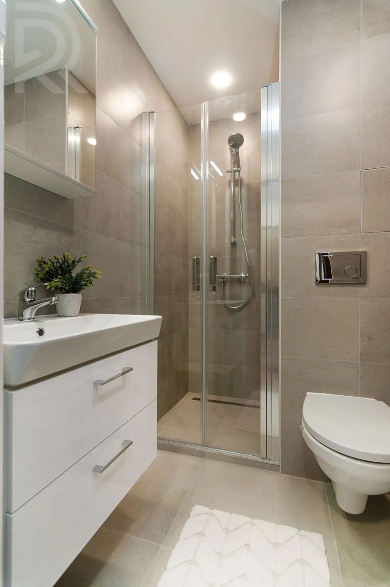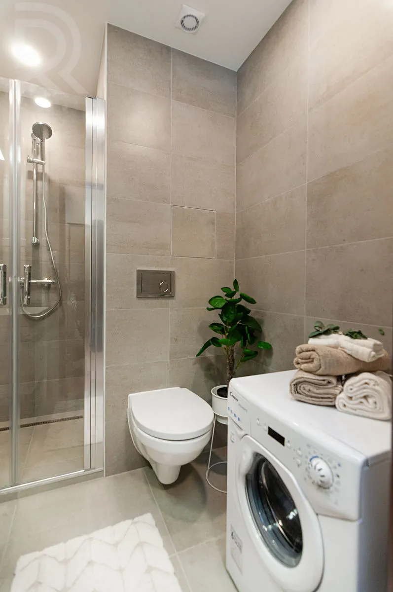 Koupelna má sprchový kout s termo hlavicí, umyvadlem, koupelnovými skříňkami a toaletou. K dispozici je malá pračka.